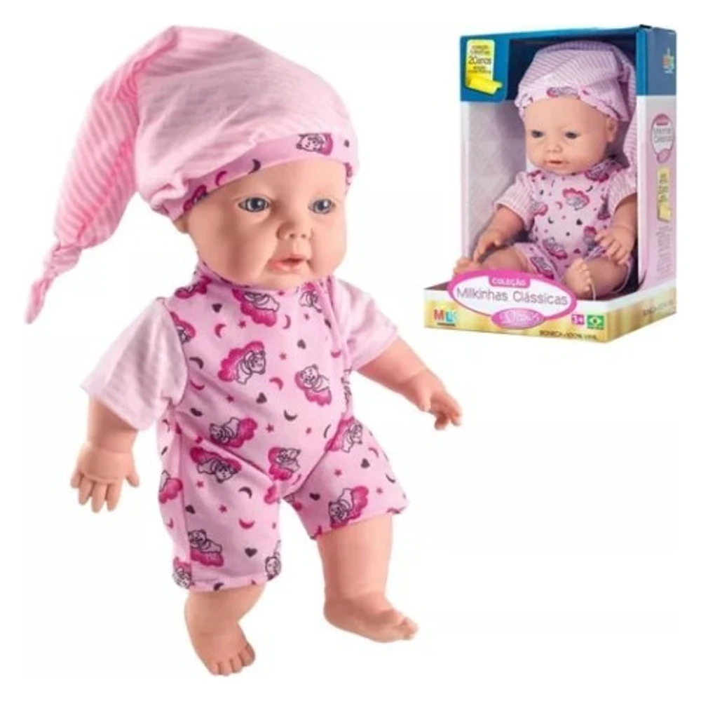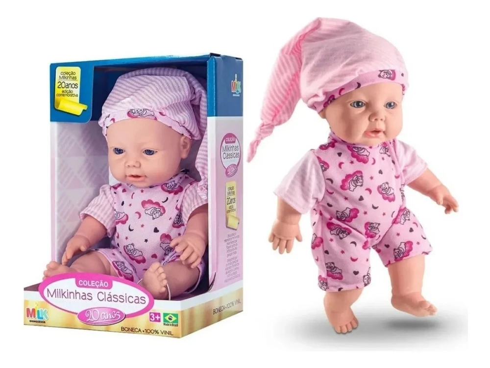 BONECA COLECAO MILKINHAS CLASSICAS PIJAMINHA - MILK Você vai se encantar com essa linda bonequinha Milkinhas Classicas Pijaminha.Vem com um pijaminha delicado e uma toquinha na cabeça tudo com um ótimo acabamento.Vai fazer você relembrar os momentos mais felizes que fizeram parte da sua infância.Ela é muito delicada, gostosa de abraçar e apertar.Junto com sua amiguinha vocês vão se divertir muito!Benefício: Estimula a interação entre pais e filhos, coordenação manual, a criatividade e imaginação da criança.Idade mínima recomendada: +3 anosDimensões aproximadas da embalagem: (AxLxC) ? 27x16x19cmComposição/Material: Boneca de Vinil / Roupa em TecidoSom: NãoArticulado: SimAbre e fecha o olho: NãoCertificação: INMETRO 001543/2019Fabricante: MILK BRINQUEDOSConteúdo da embalagem: 01 boneca