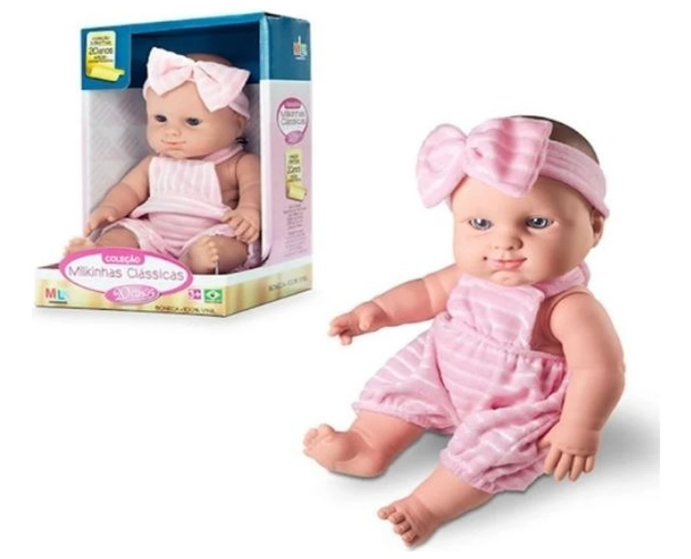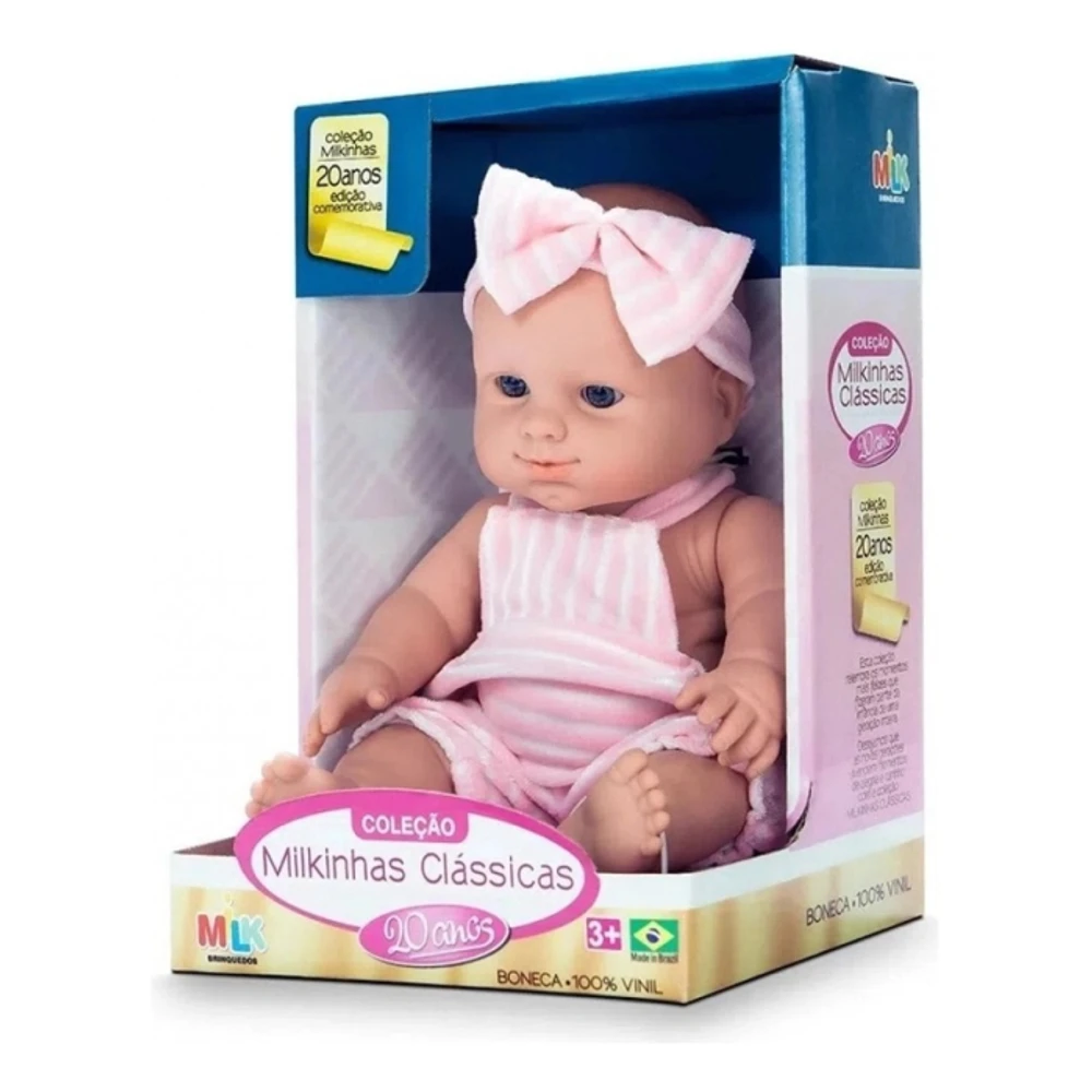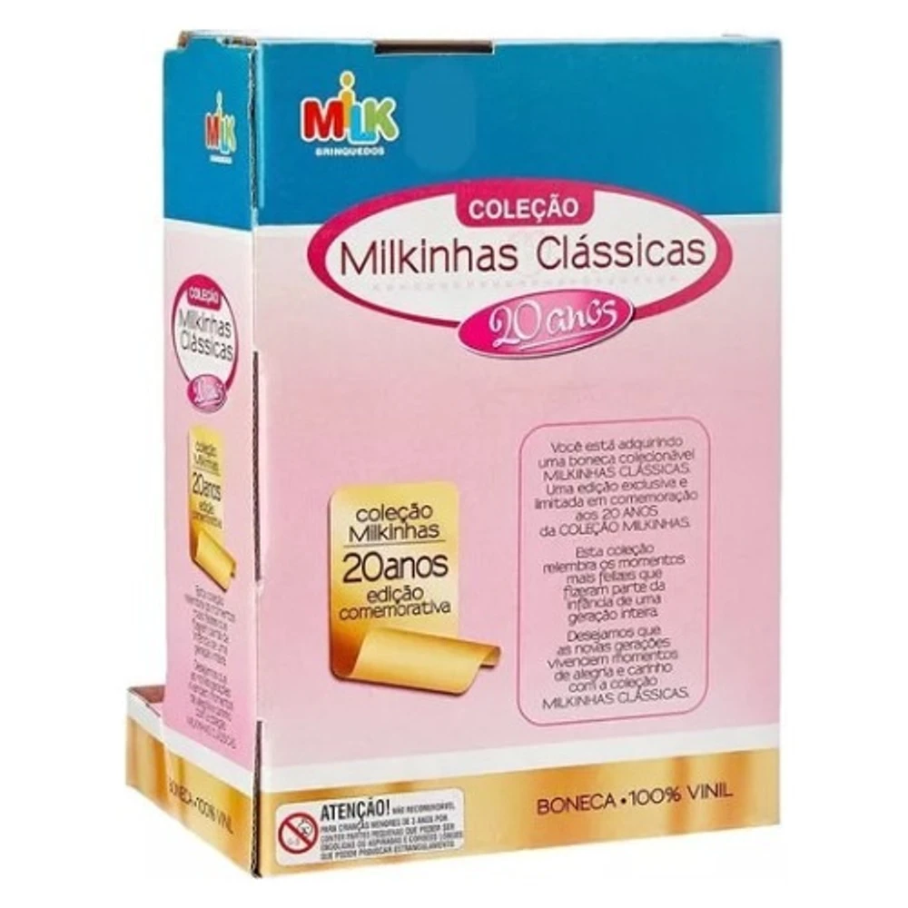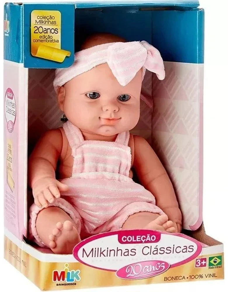 BONECA MILKINHAS CLÁSSICAS - MILK BRINQUEDOS Uma linda boneca que vai encantar as garotinhas!Ela faz parte da Coleção Milkinhas Clássicas, que traz 5 modelos diferentes para a criança colecionar! As meninas vão amar!Boneca 100% vinil.Estimula a interação entre pais e filhos, coordenação motora, criatividade e imaginação da criança.ESPECIFICAÇÕES:- Recomendado para crianças à partir de 3 anos- Dimensões da embalagem (CLA): 18 x 15.5 x 27 cm- Altura aproximada da boneca: 31 cm- Modelo: Clássica, Pijaminha, Tubarão, Sapinho e Vaquinha- Marca: Milk Brinquedos- Referencia: 547- Certificado de Segurança: INMETRO- As cores e tons podem variar de acordo com o lote de fabricação