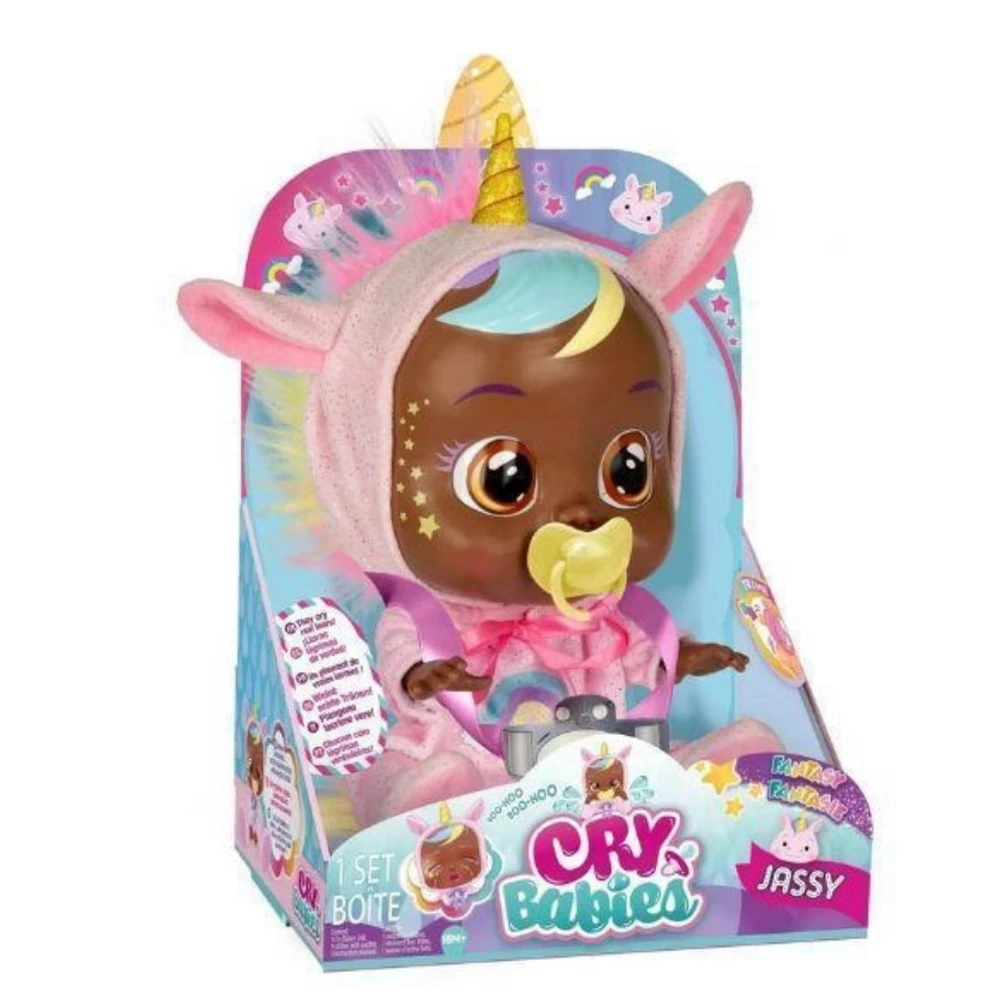 Conheça Cry Baby Jassy. Ela chora lágrimas de verdade e faz sons realistas de bebê quando você tira sua chupeta Dê-lhe doces abraços ou gentilmente deitá-la para impedi-la de chorar. Ela também vem com sua própria onesie temática mutável. Cry Babies são tão divertidos e promovem brincadeiras imaginativas.