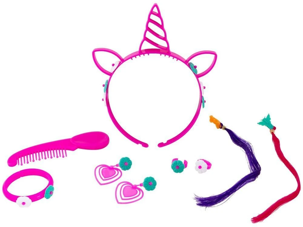 Composição: 01 Boneca, 02 anéis, 01 pulseira, 01 par de brincos, 01 tiara de unicórnio, 02 mechas de cabelo, 1 pente