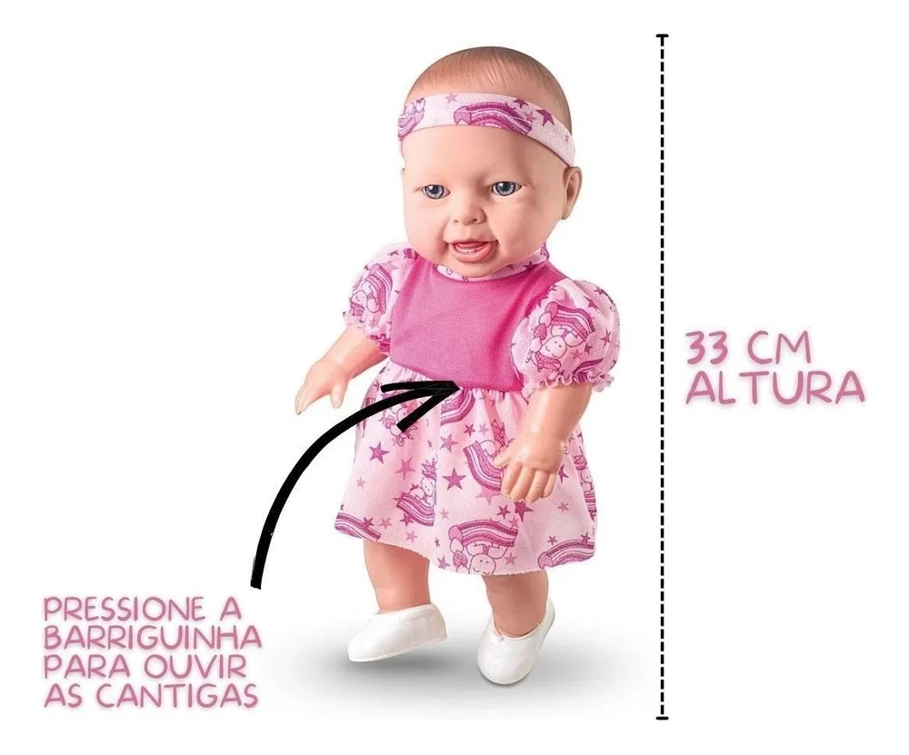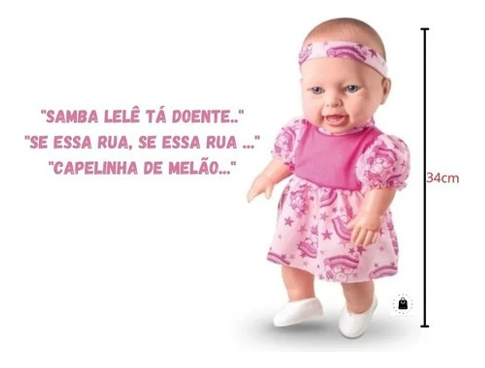 Está linda boneca canta as cantigas que a anos fazem sucesso, todas as crianças vão aprender.