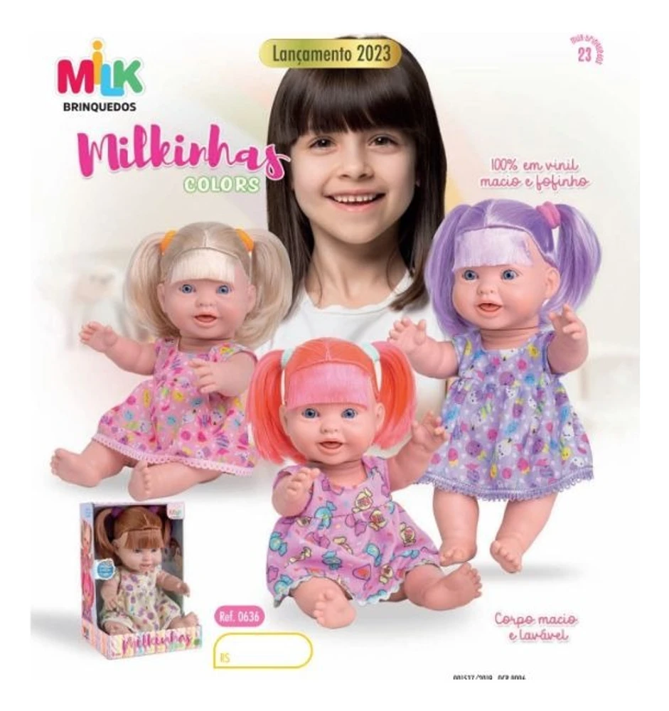 BONECAS COLEÇÃO MILKINHAS COLORS - 100% VINIL MACIO E LAVAVELCOM ROUPINHAS LINDAS E COLORIDAS, COM TECIDO DELICADOCABELOS SEDOSOS E CADA MODELO COM UMA COR DIFERENTE E VIBRANTE!DIMENSÕES DA EMBALAGEM :LARGURA: 15CMALTURA: 26CMCOMPRIMENTO: 18CMPESO APROXIMADO : 600 GRAMAS