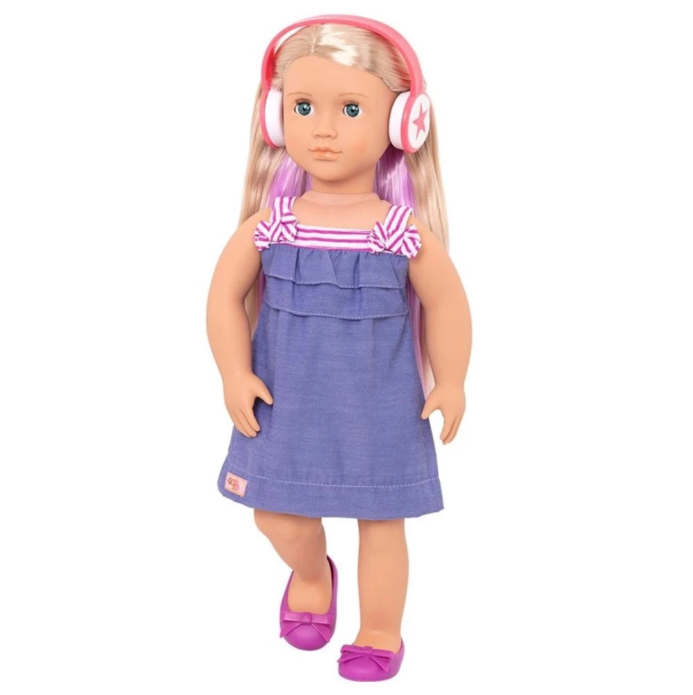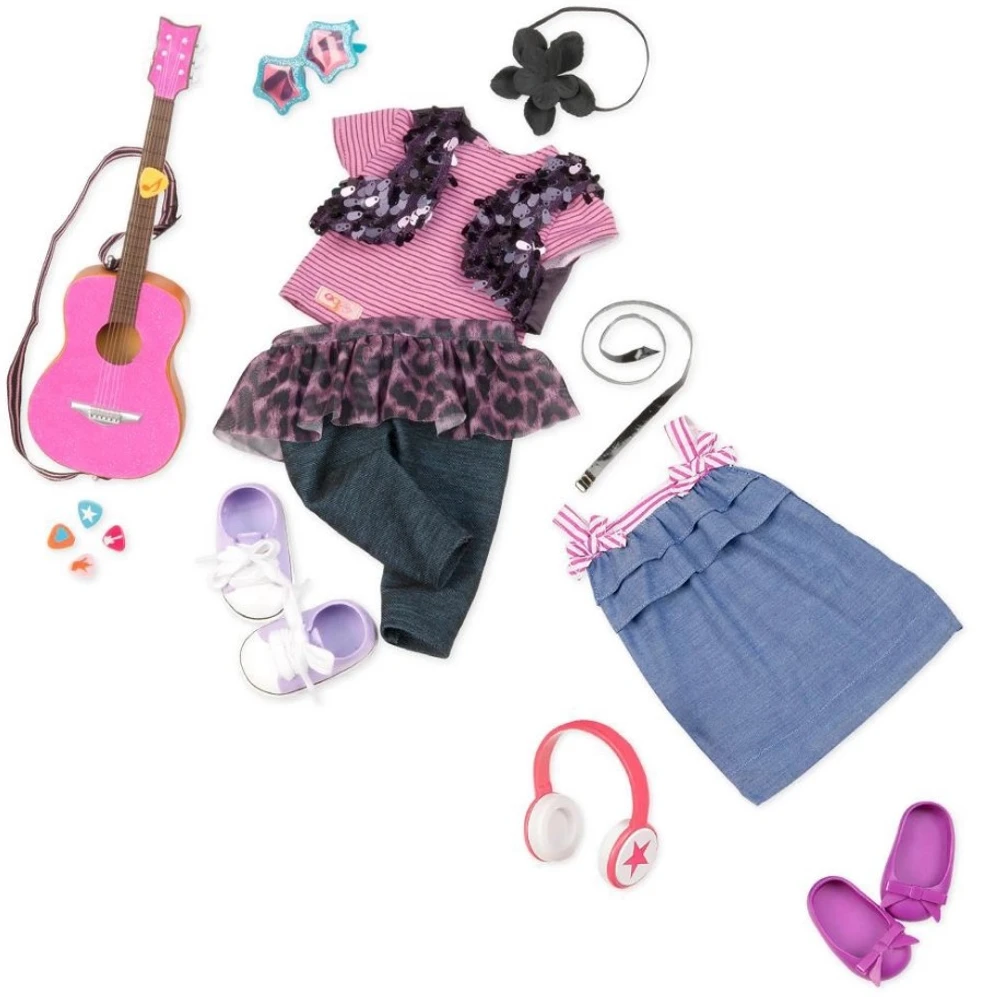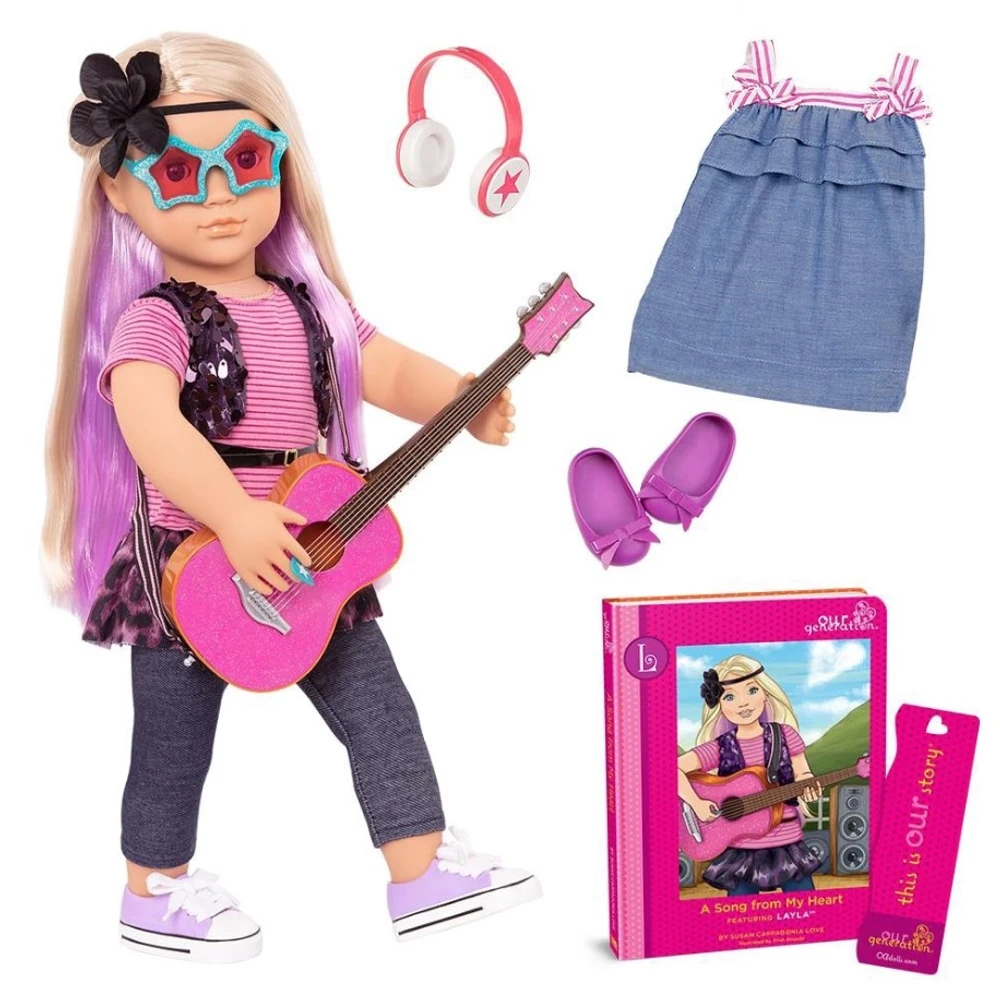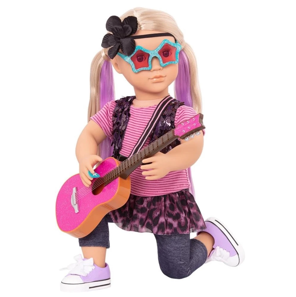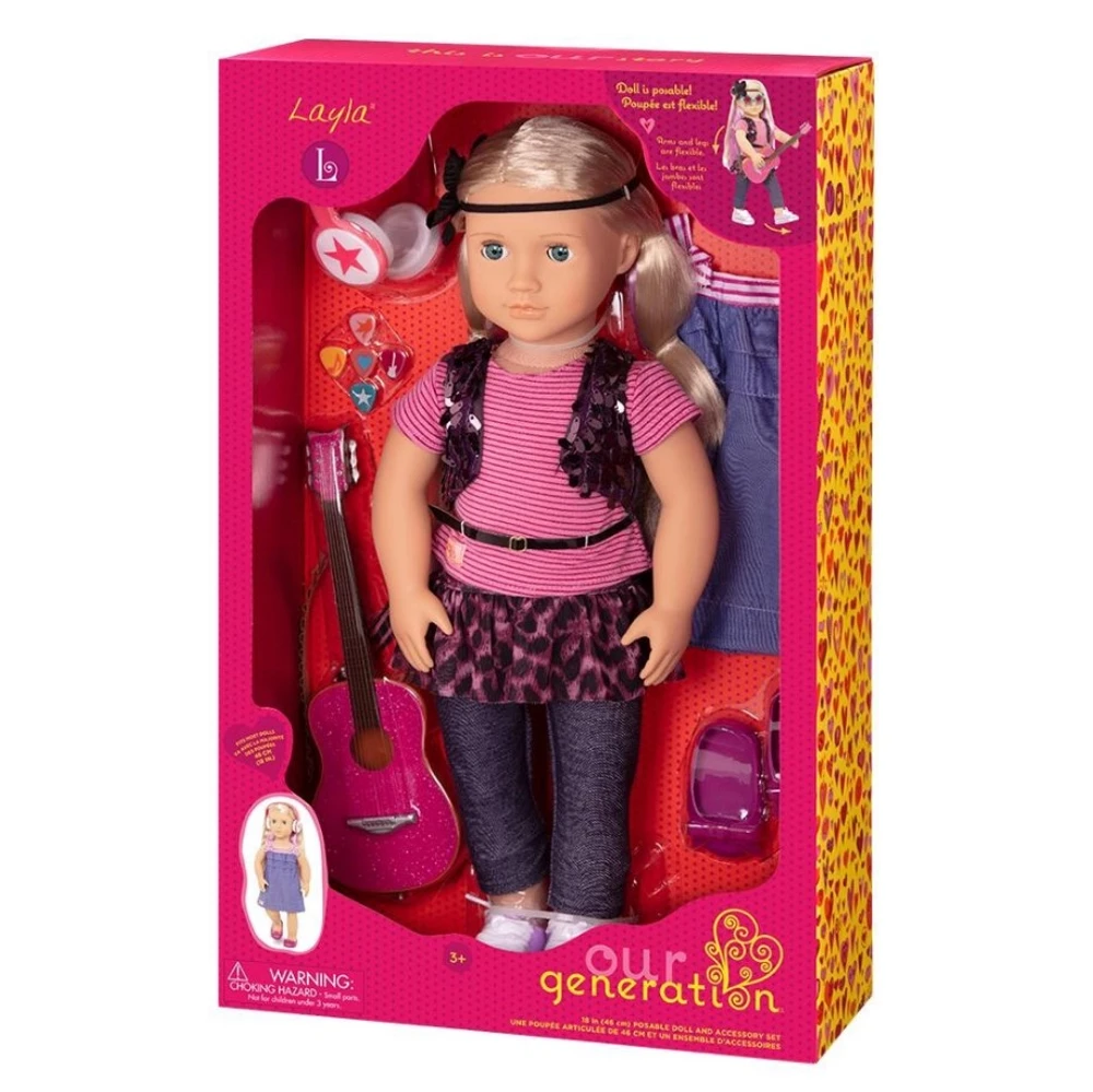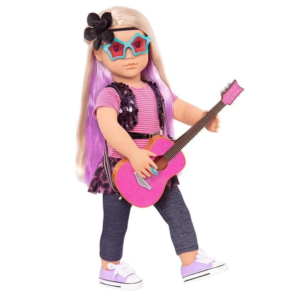 Sua música irá capturar a imaginação do público em todos os lugares com Our Generation Boneca Deluxe - Layla, uma linda boneca com olhos azuis e longos cabelos loiros tingidos de roxo, bem rock 'n' roll e divertido de pentear e pentear. Layla está pronta para cantar! Ela usa sua roupa de performance - uma camiseta rosa, legging azul com saia de estampa de leopardo, um colete de lantejoulas, faixa para a cabeça e seus óculos de sol favoritos em forma de estrela. Sua segunda roupa inclui um vestido jeans doce e confortável e sapatos baixos. Não se esqueça do violão dela! Ela vem com outros acessórios legais para músicos também!