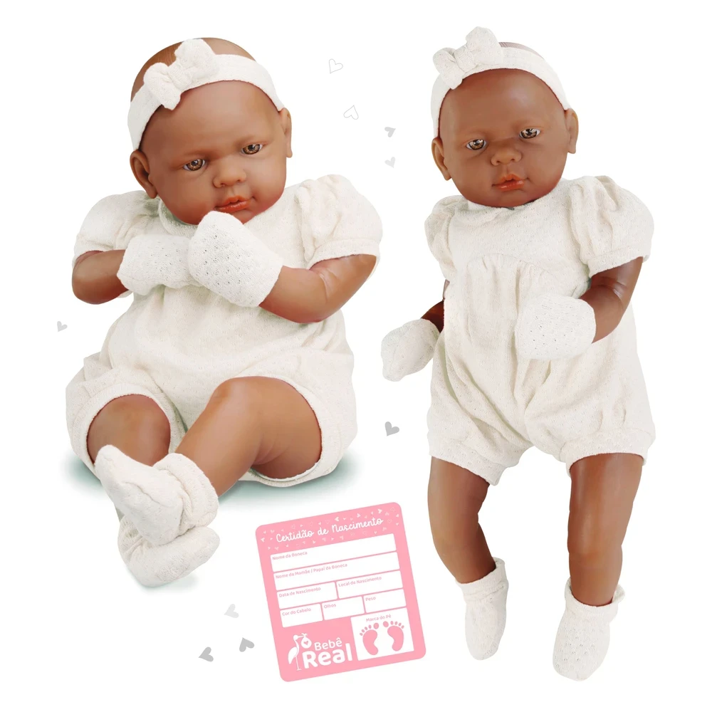 A Boneca Bebê Real Negra da Roma Jensen encanta com seu realismo e delicadeza. Feita em vinil especial, tem a cor e os traços de um bebê recém-nascido, com detalhes como dobrinhas na pele e acabamento que imita costuras. Possui o peso ideal para proporcionar a sensação de segurar um bebê de verdade, tornando a brincadeira ainda mais envolvente.