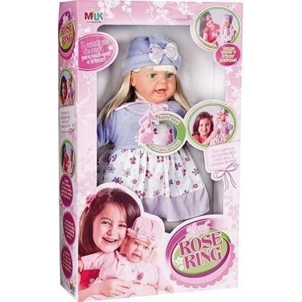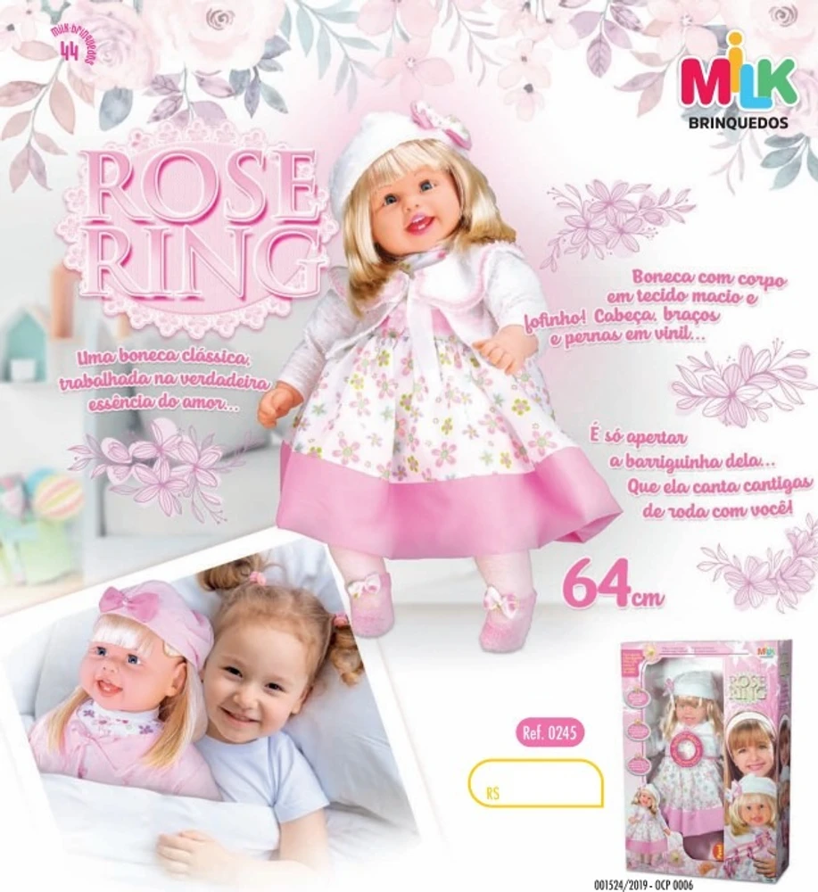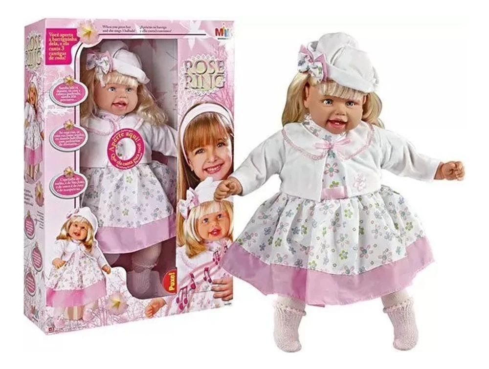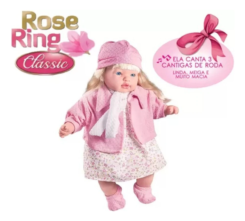 BONECA BEBE ROSE RING CLASSIC CANTIGA DE RODASA Bebezinha mais fofa chegou para deixar suas brincadeiras ainda mais divertidas! A Boneca Bebê Rose Ring Classic é cheia de detalhes que vão encantar você, ela canta 3 cantigas de roda, seu corpinho é todo macio, as mãozinhas e pezinhos são com dobrinhas e furinhos como um bebezinho, Acompanha gorrinho, meinha e a roupinha é toda decorada. Tudo isso para você se divertir, sendo mamãe. Divirta-se em qualquer lugar com sua bebezinha Rose Ring Classic!*BENEFICIOS: Estimula a interação entre pais e filhos, estimula a criatividade, é sensorial, estimula a imaginação, desenvolve a fala, a comunicação, a afetividade, a coordenação motora, o reconhecimento de formas e cores, a interação social e cultural, brincando, desenvolve-se a criança num todo!*INFORMAÇOES TECNICAS:Idade Mínima Recomendada: + 3 anosDimensões Aproximadas da Embalagem (AxLxC): 33cm x 26cm x 46cmDimensões Aproximadas da Boneca: 40cm alturaMaterial Composição: Corpo enchimento / Cabeça Braços e Pernas VinilAbre/Fecha olho: NãoArticulada: NãoPode Molhar: NãoSom: Sim, 3 cantigas de rodaPilha/Bateria: 3 AG13/LR44Luz: NãoFabricante: Milk BrinquedosINMETRO REGISTRO 001524/2019Conteúdo da Embalagem: 01 Boneca