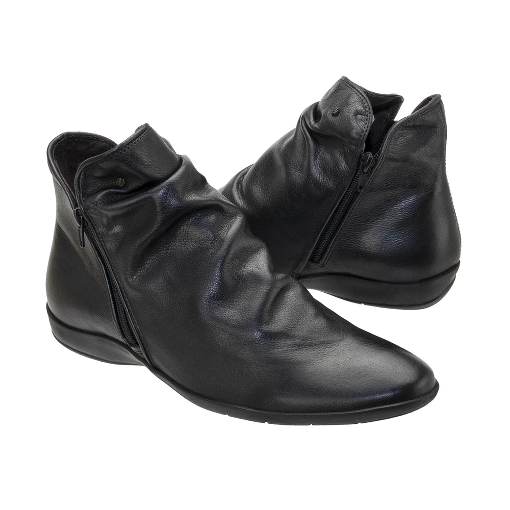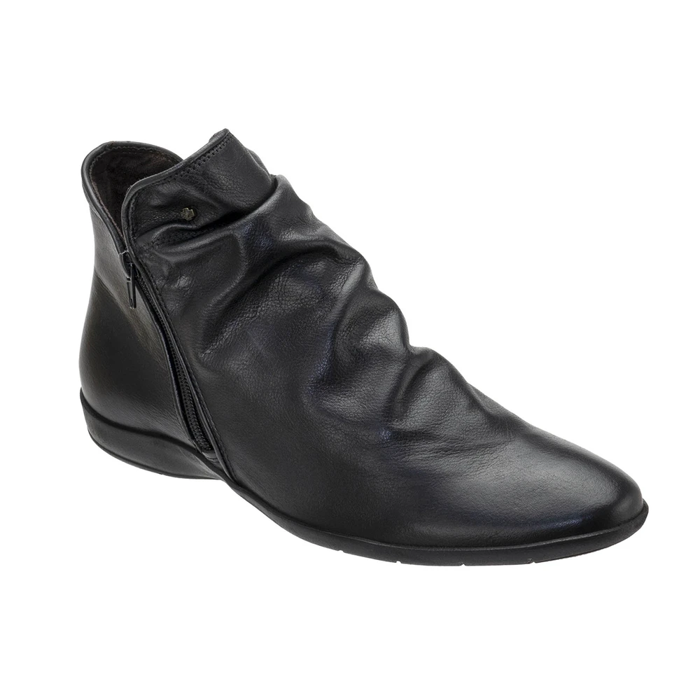 Bota cano curto em couro com saltinho quadrado de 5 cm de altura.
