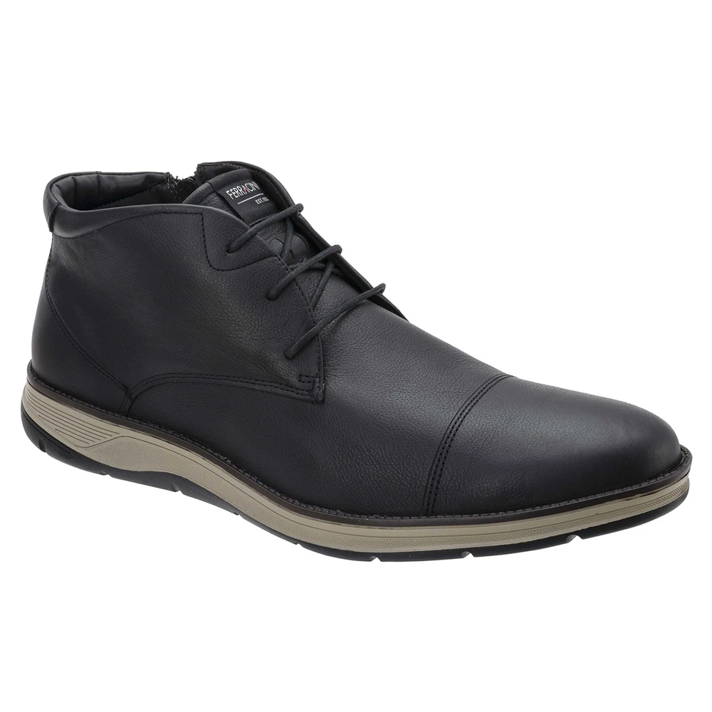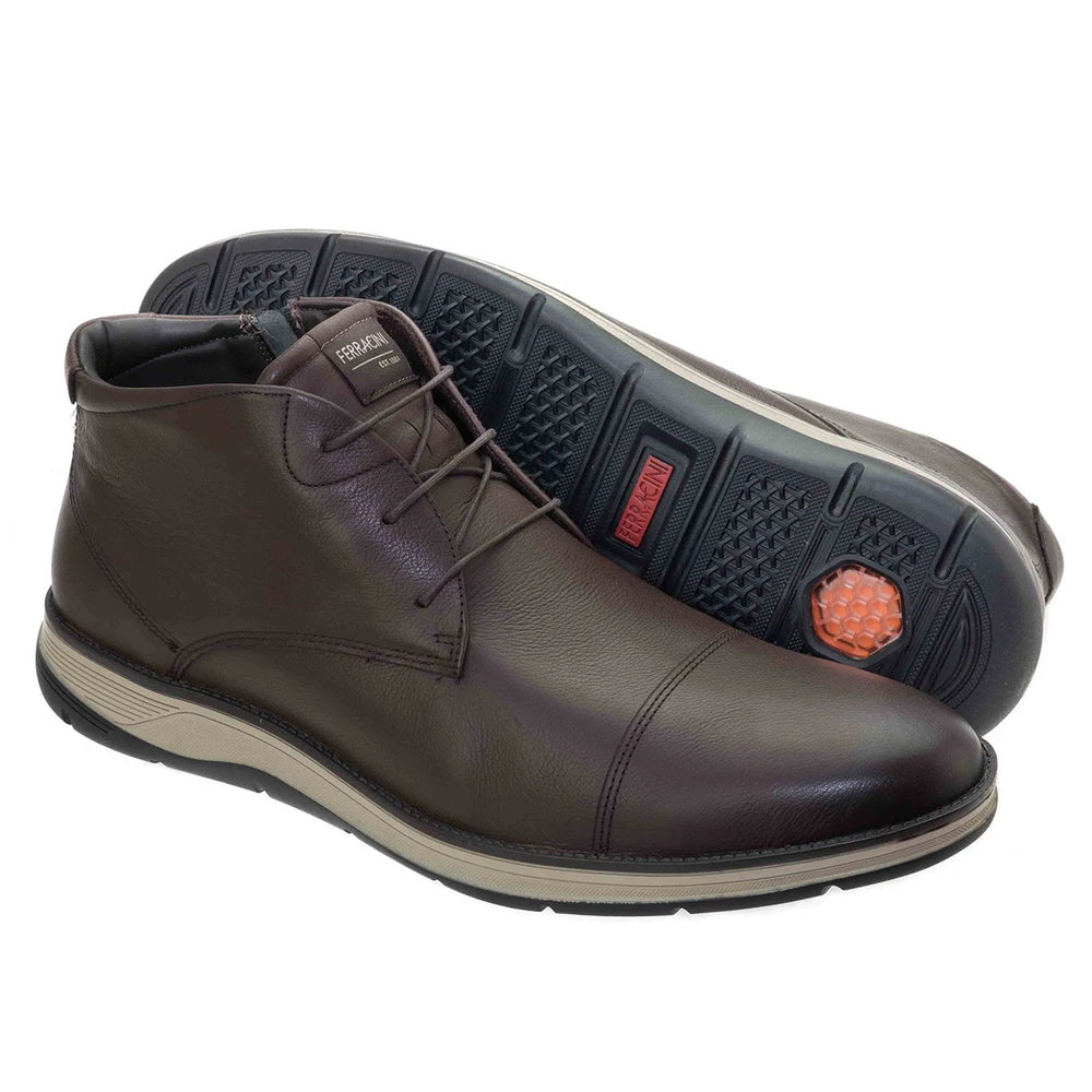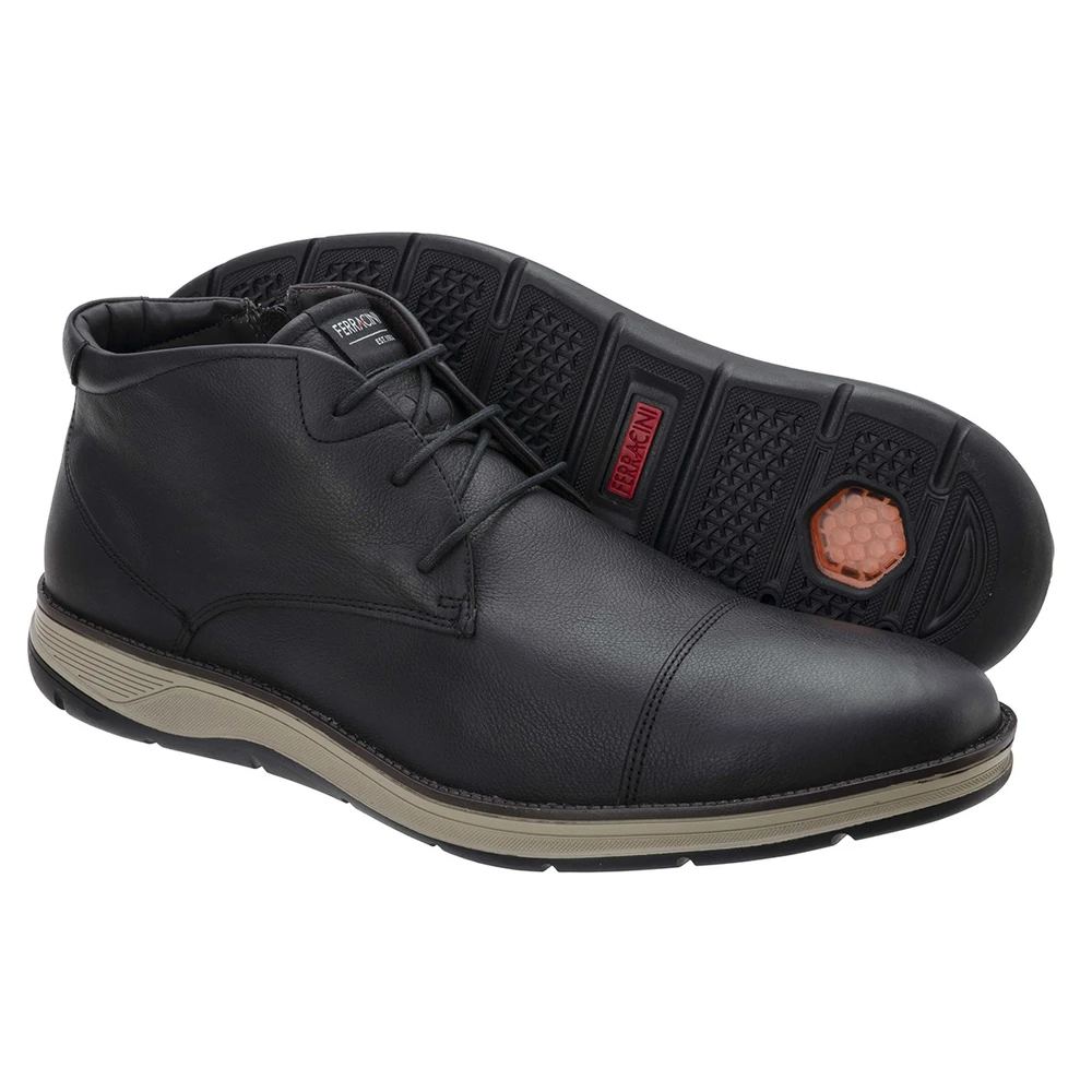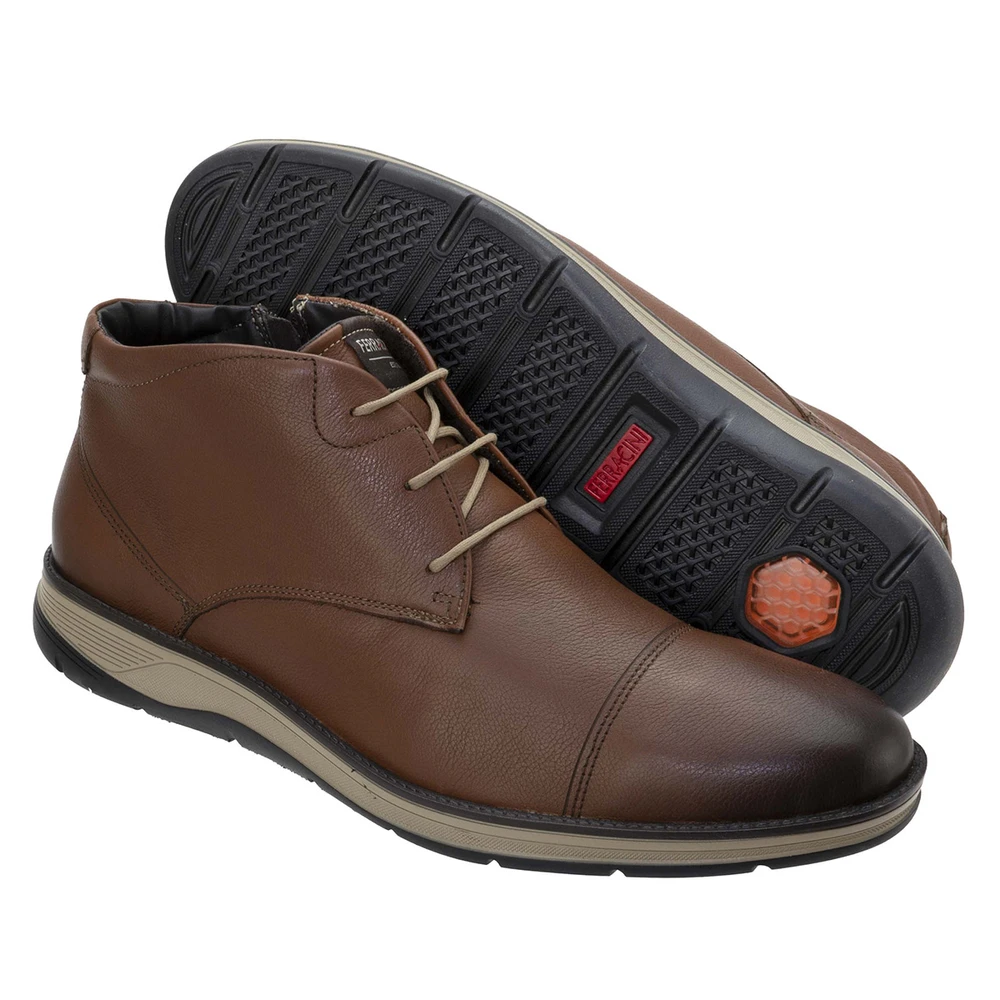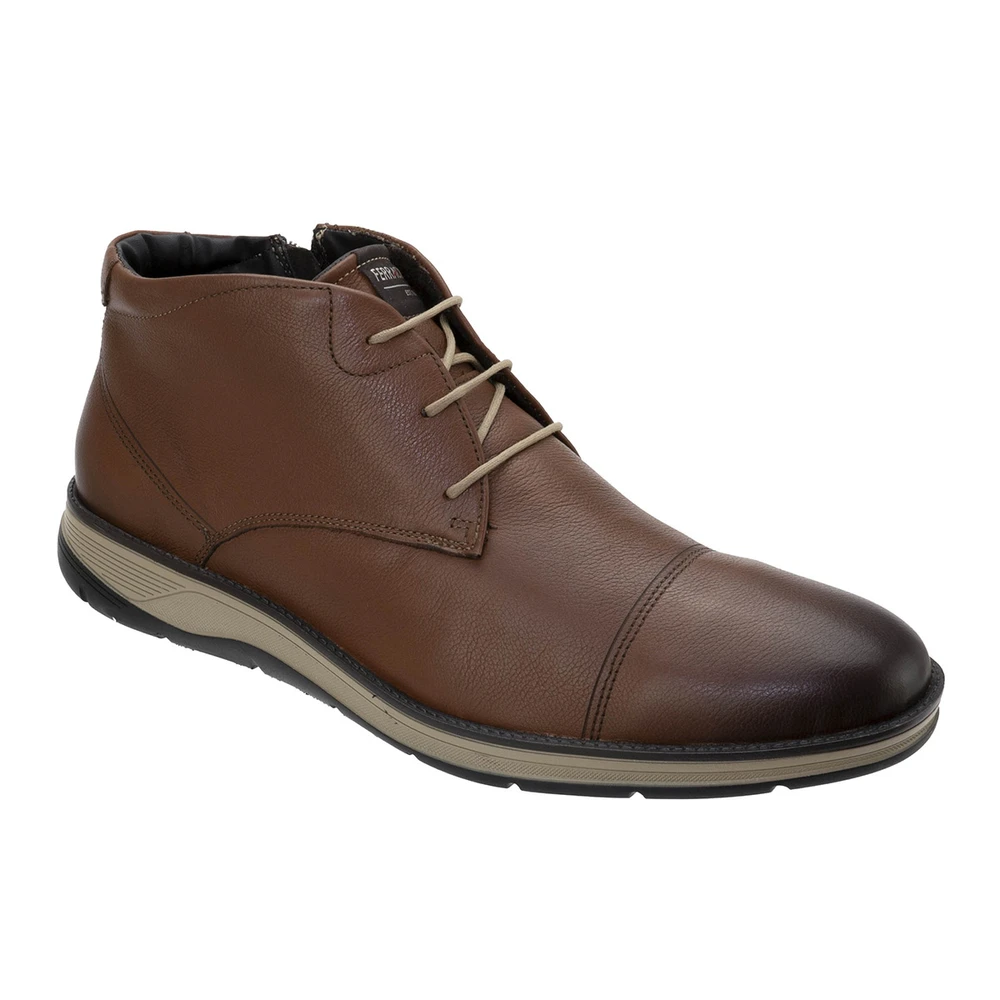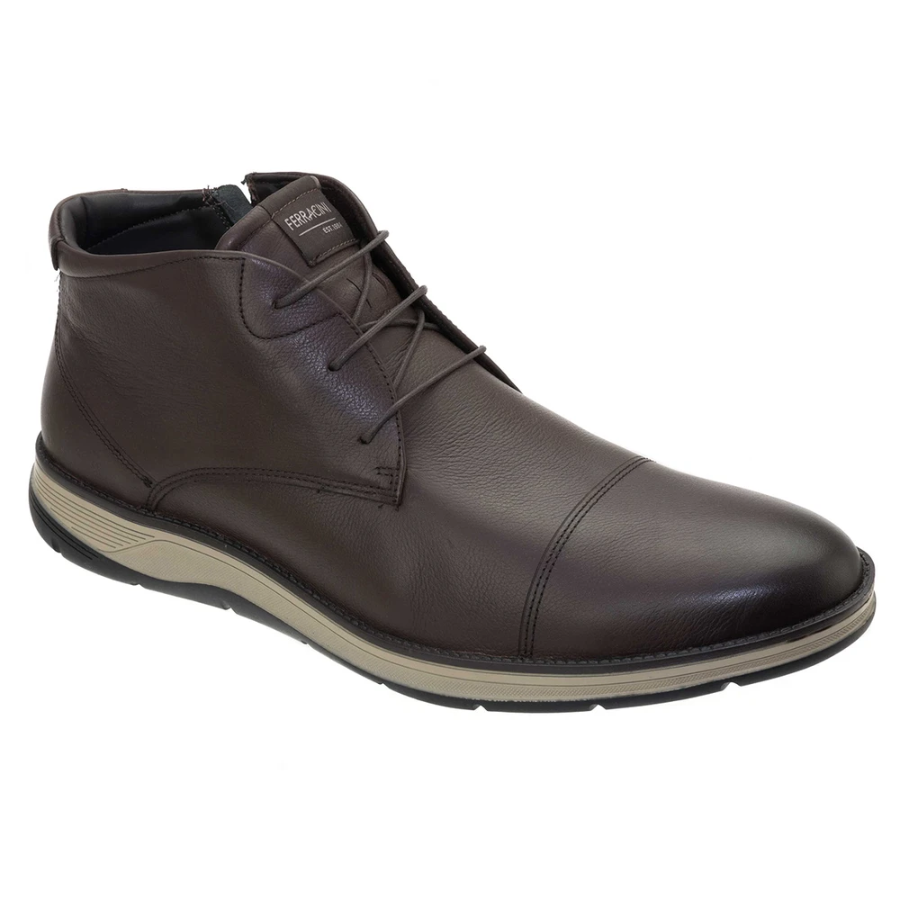 Bota Ferracini, confeccionada em couro com 12cm de cano, 25cm de largura e 3cm de salto quadrado.