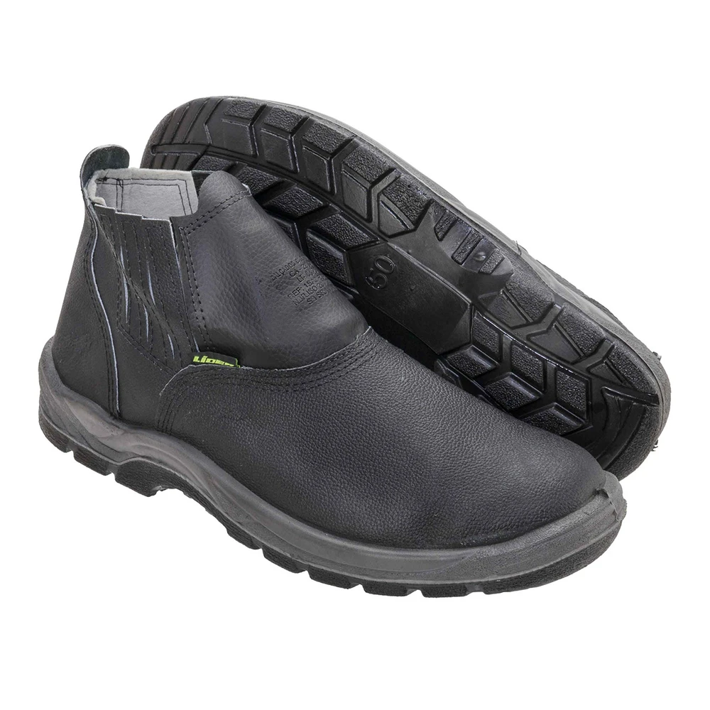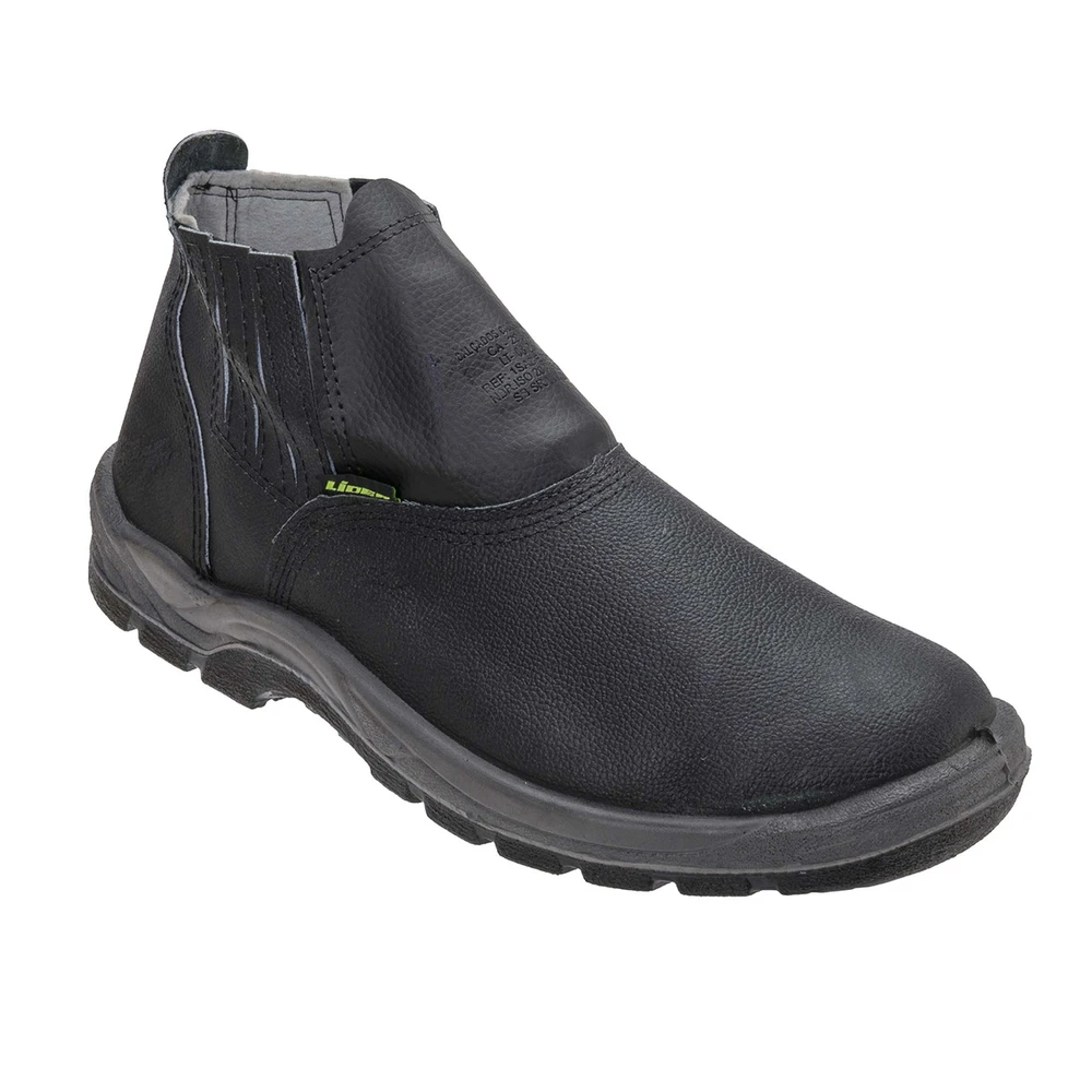 Botina de segurança em couro relax, com fechamento em elástico, com biqueira de segurança em PVC e solado bidensidade injetado direto ao cabedal.