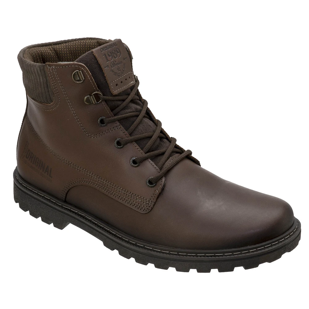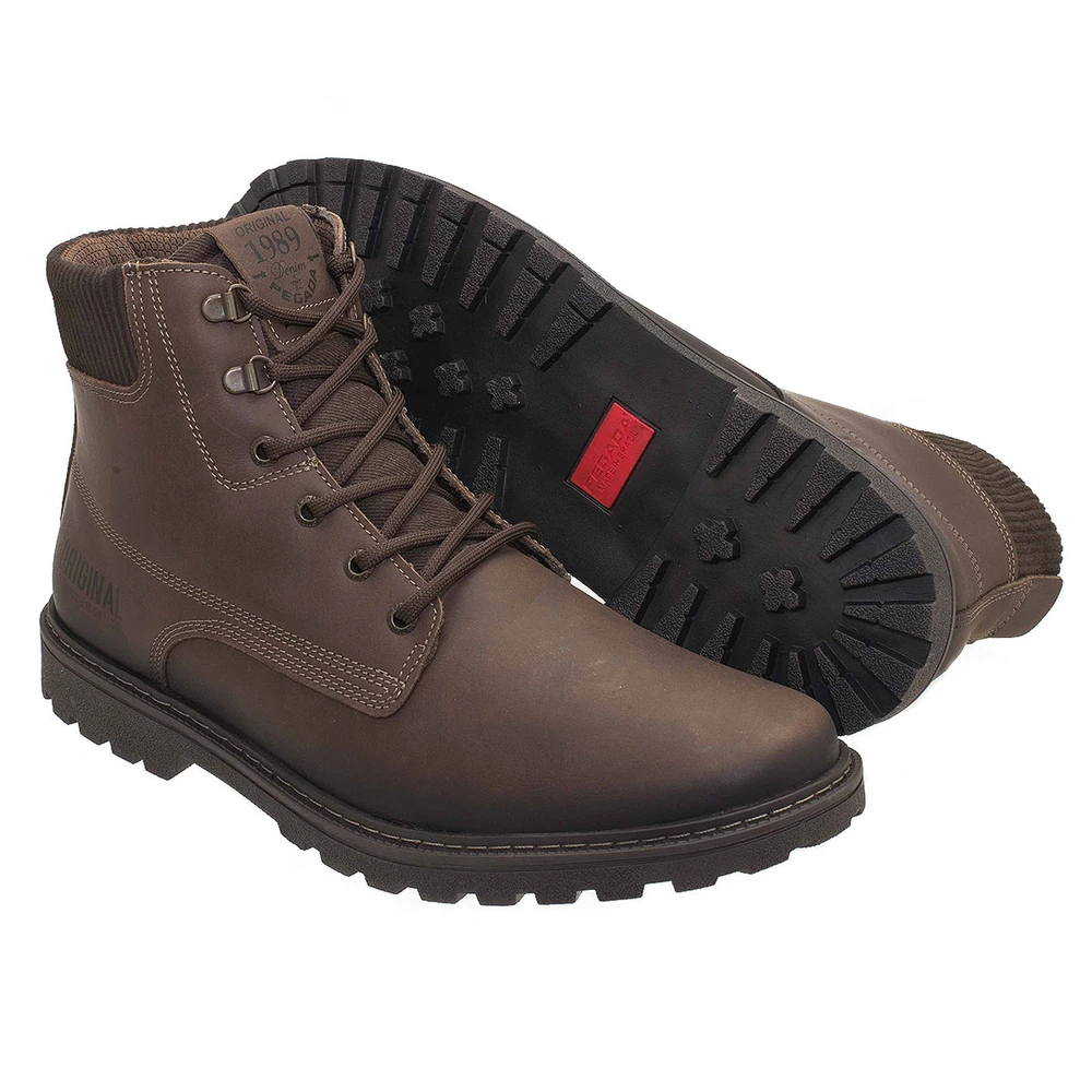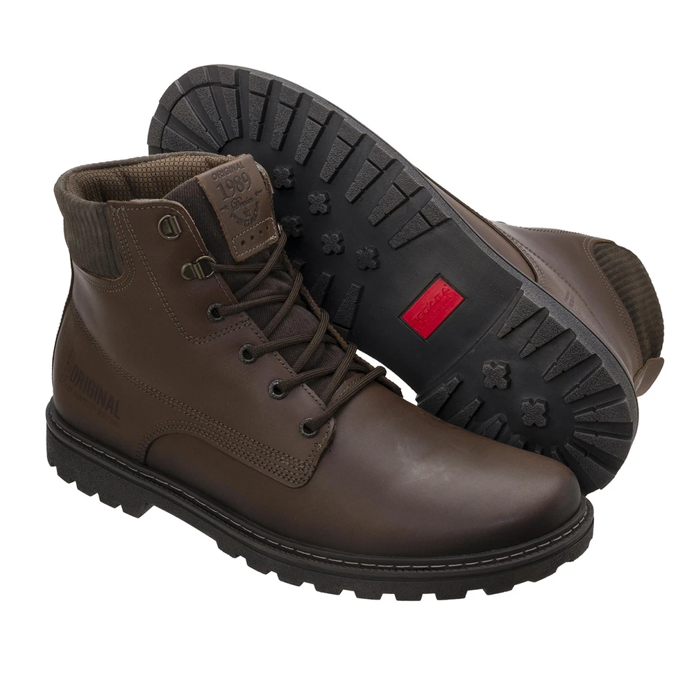 Botinha em couro com solado em borracha. Com cadarço reforçado, toda costurada.