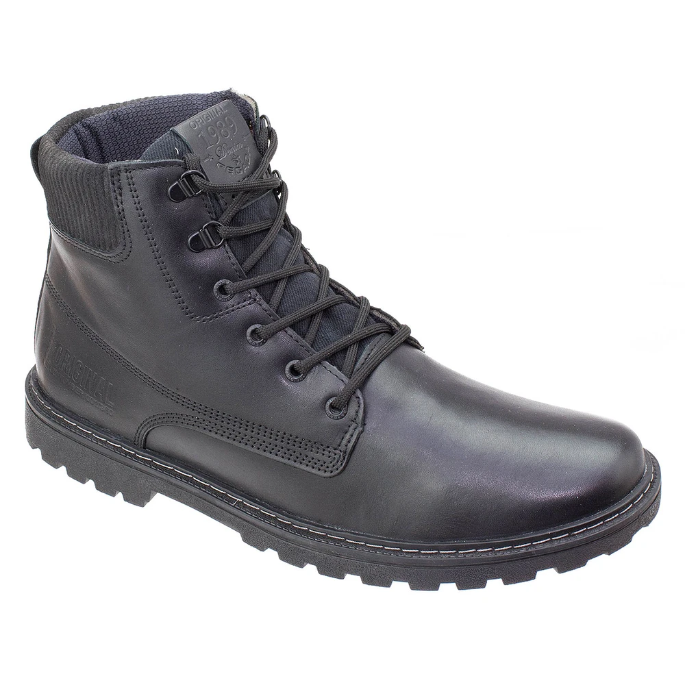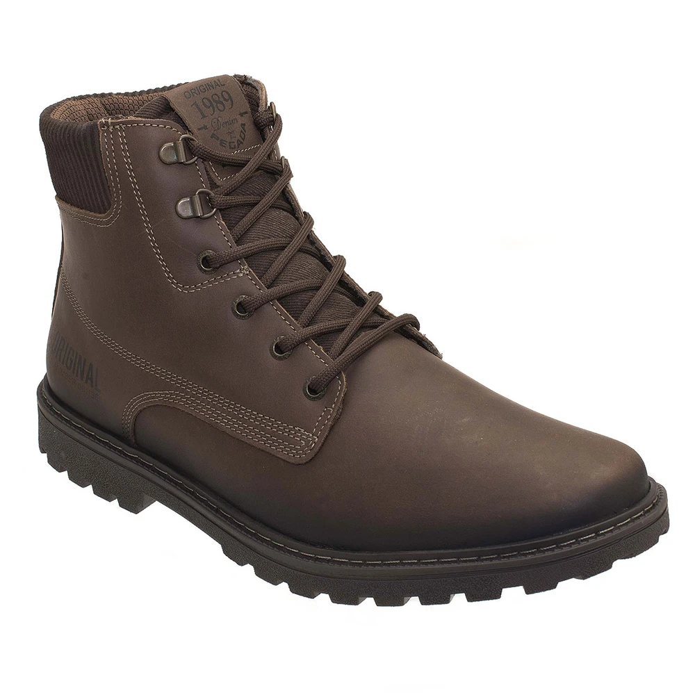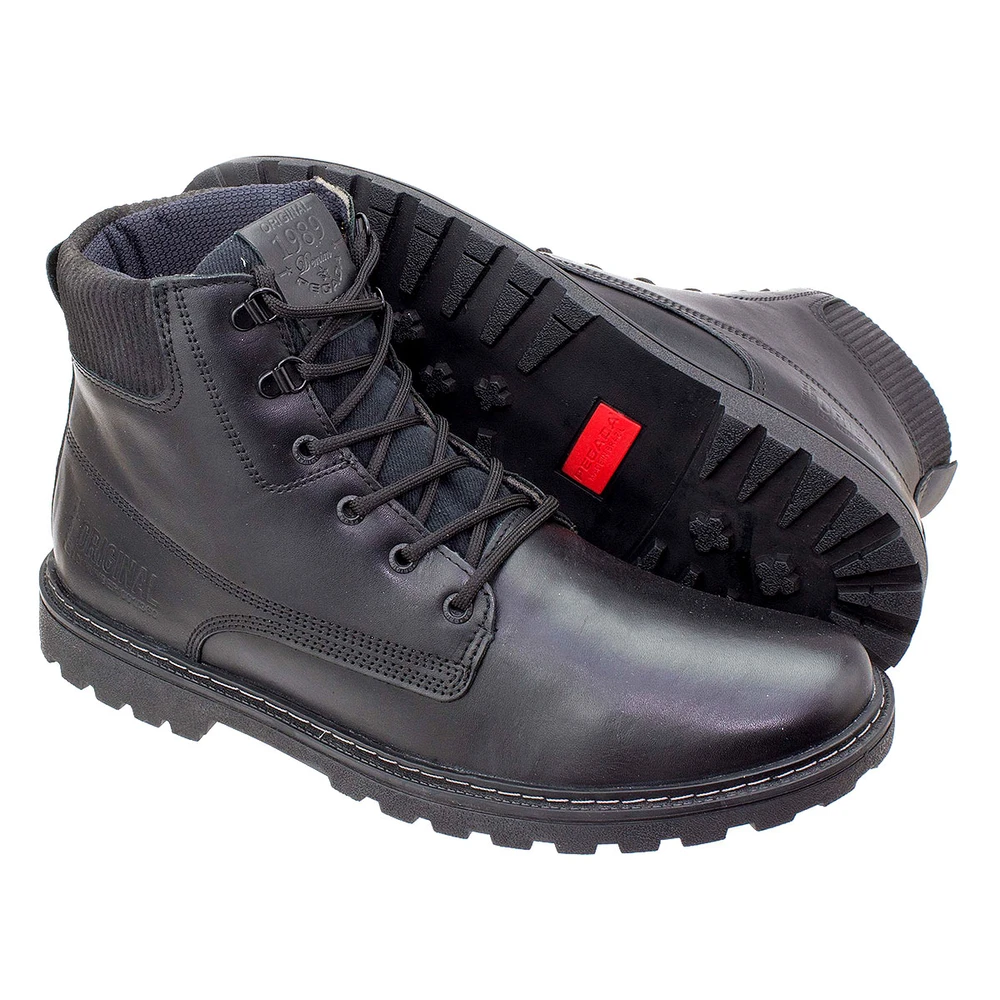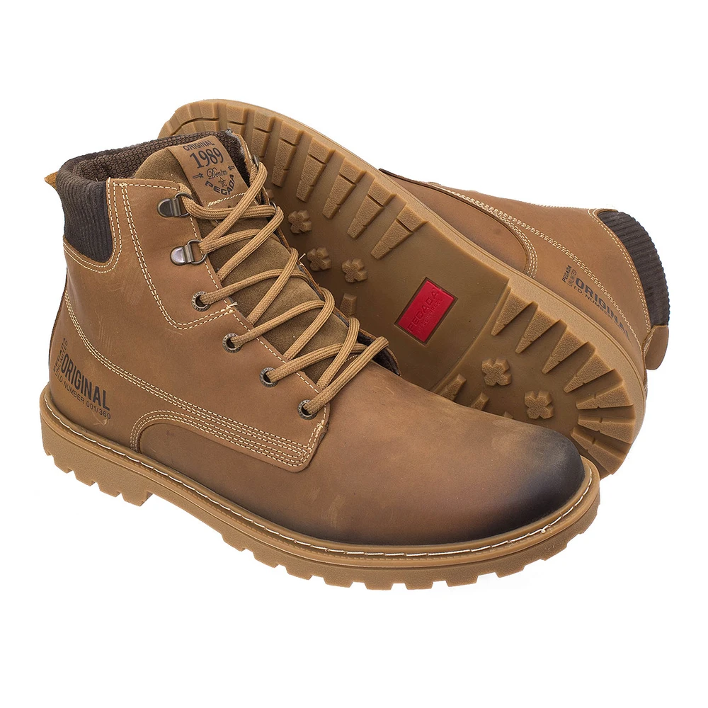 Botinha em couro com solado em borracha. Com cadarço reforçado, toda costurada.