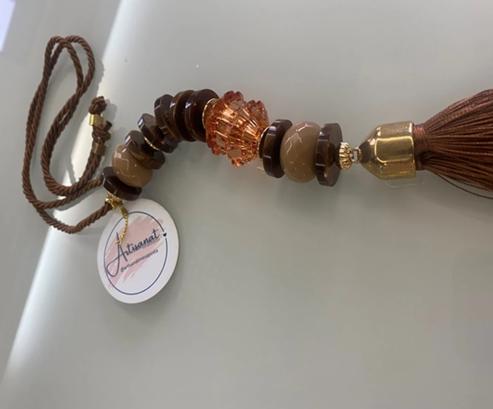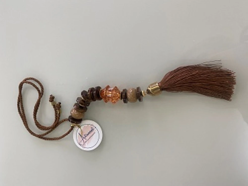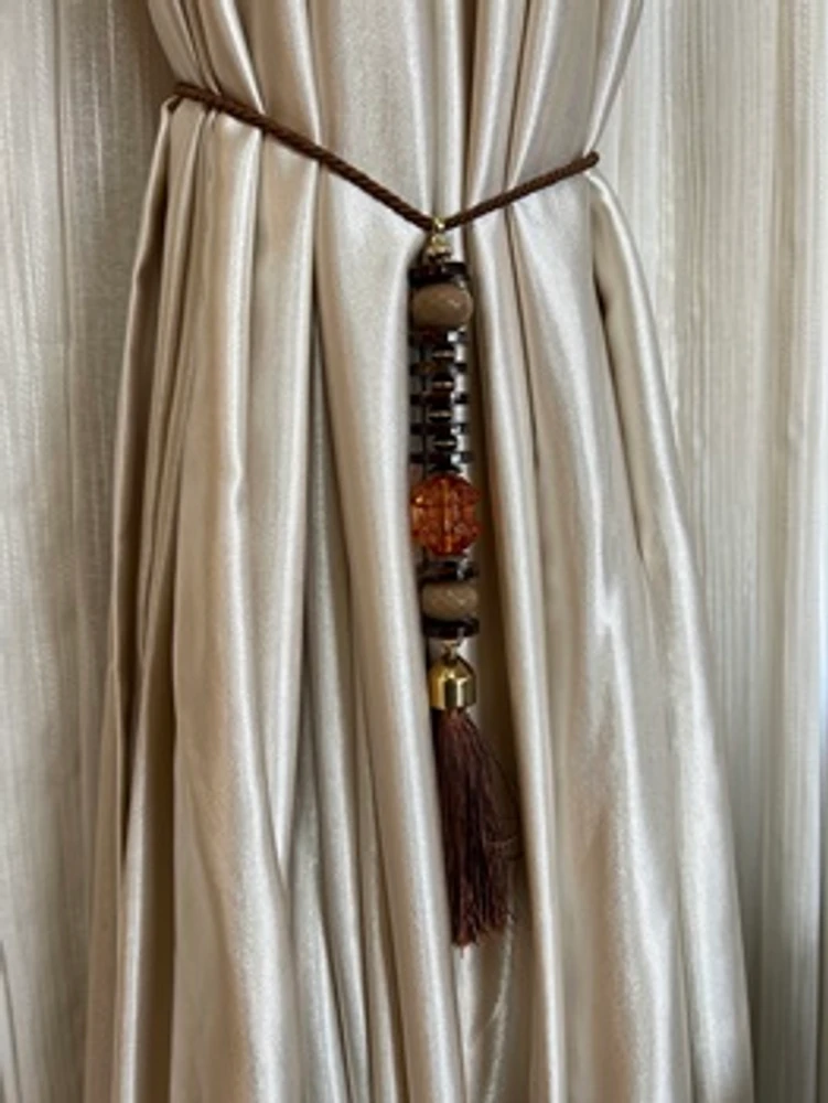 Abraçadeira de Cortina feita com resinas e tassel  na cor marron.