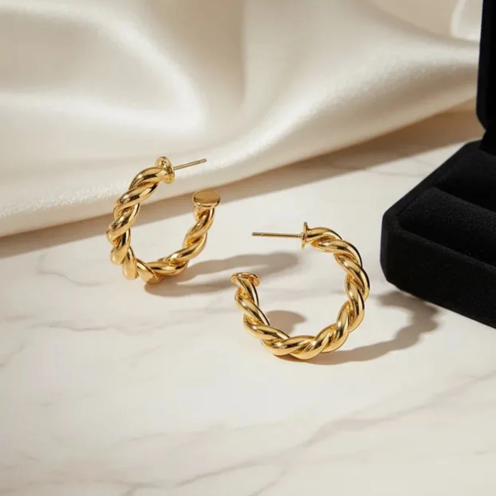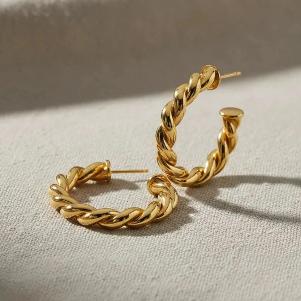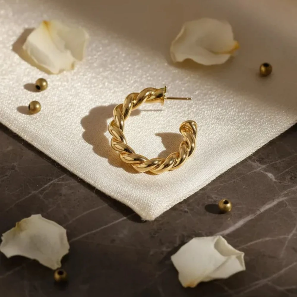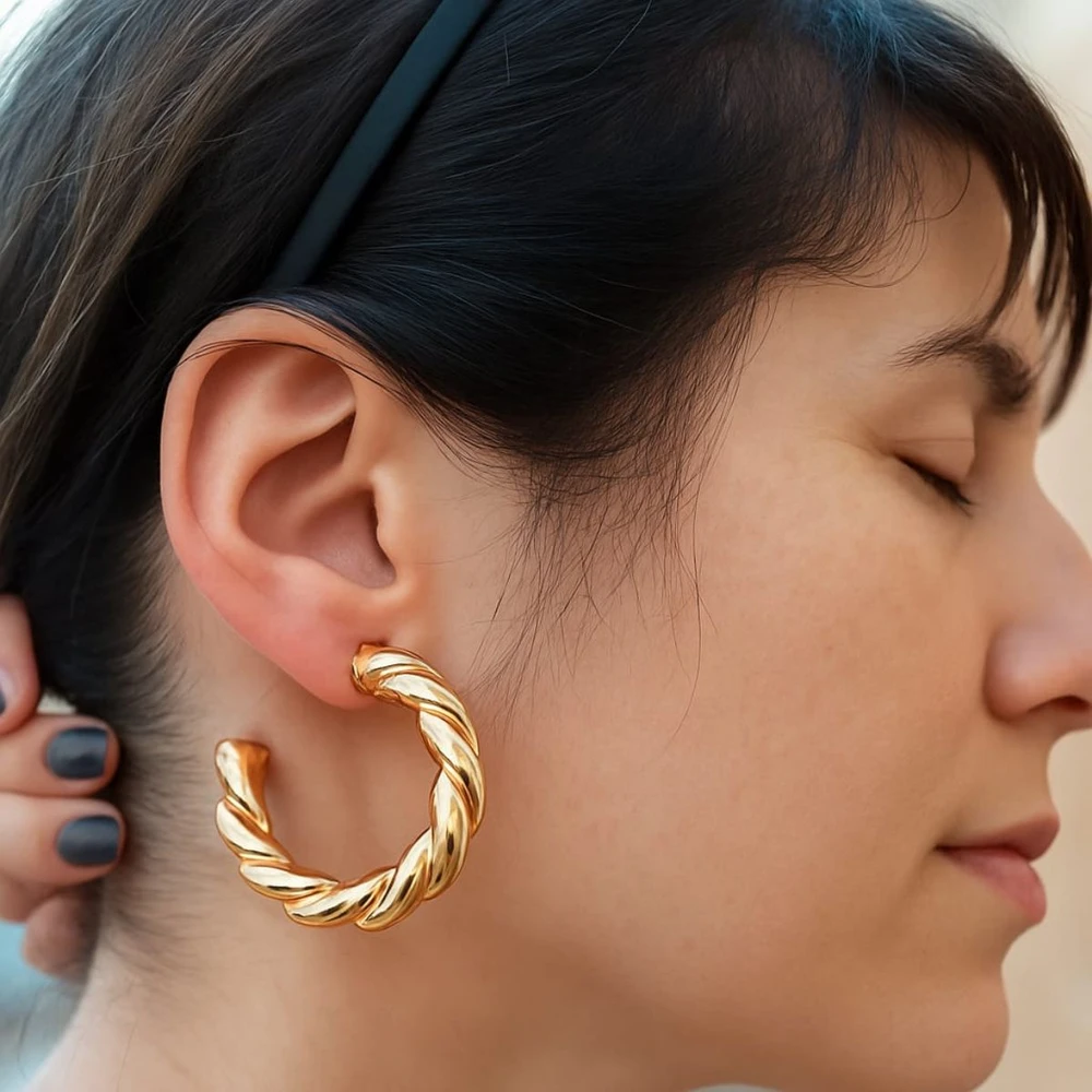 Meia Argola Trançada e Lisa Banhada a Ouro.