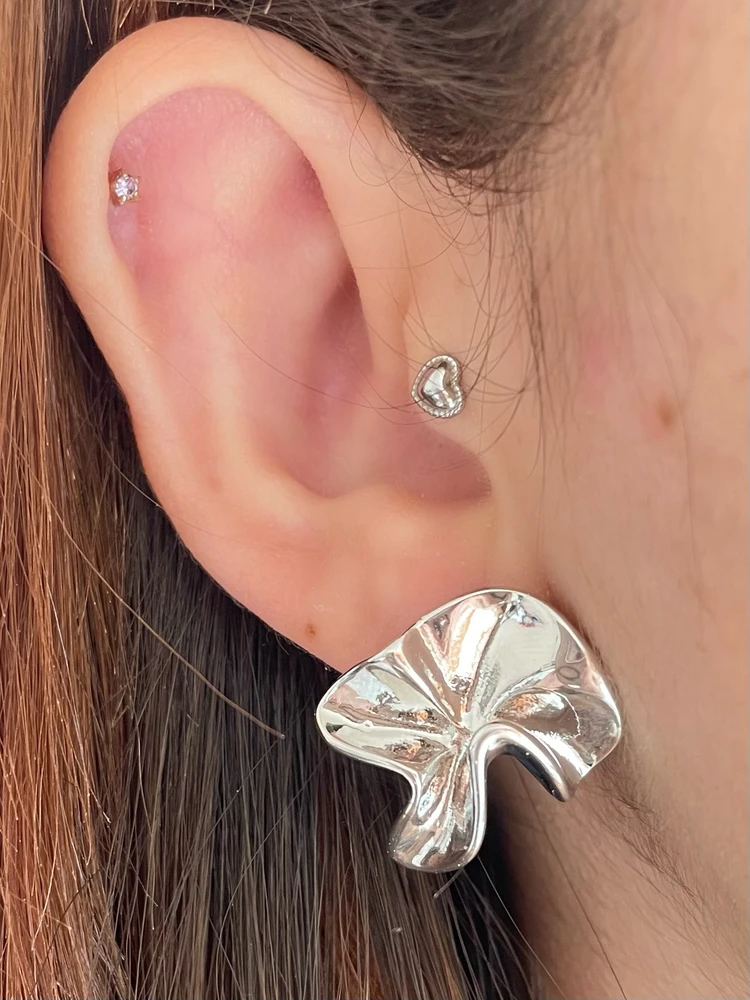 Feito em metal liso com acabamento polido, o brinco tem brilho impressionante e aspecto de peça fina. O formato orgânico dá movimento e personalidade, enquanto o tamanho médio garante destaque na medida certa sem pesar na orelha.