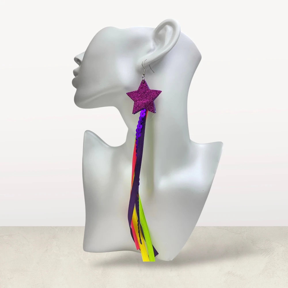 Brinco Estrela de Carnaval com Fitas Coloridas e Paetê é o acessório perfeito para quem quer entrar no clima da folia com muito brilho, cor e diversão. Com uma estrela em acabamento glitter e várias fitas multicoloridas em cetim e paetê, ele cria um visual vibrante, alegre e cheio de movimento.