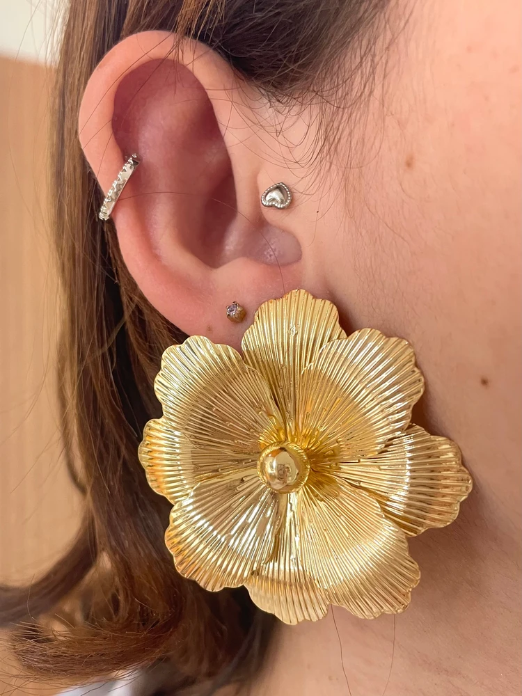 Com design contemporâneo em formato de flor e detalhe de esfera espelhada, ele traz um toque moderno que valoriza qualquer produção — desde looks casuais até os mais refinados.