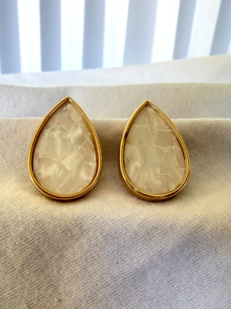 ✨ Destaques:• Formato de gota clássico e atemporal• Acrílico com efeito marmorizado moderno• Contorno dourado que valoriza a peça• Leve, confortável e fácil de combinar