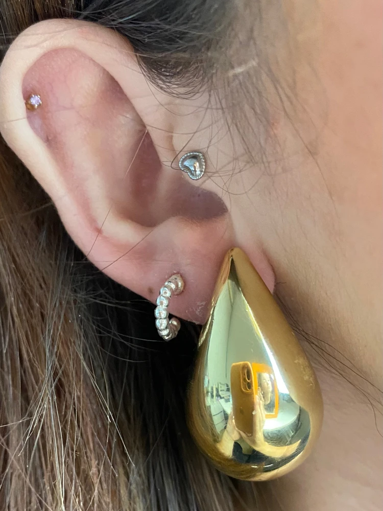 O Brinco Gota Grande Metalizada é o acessório perfeito para quem ama presença, brilho e elegância. Com design maxi em formato de gota e acabamento metalizado espelhado, ele ilumina o rosto e transforma qualquer look em segundos.
