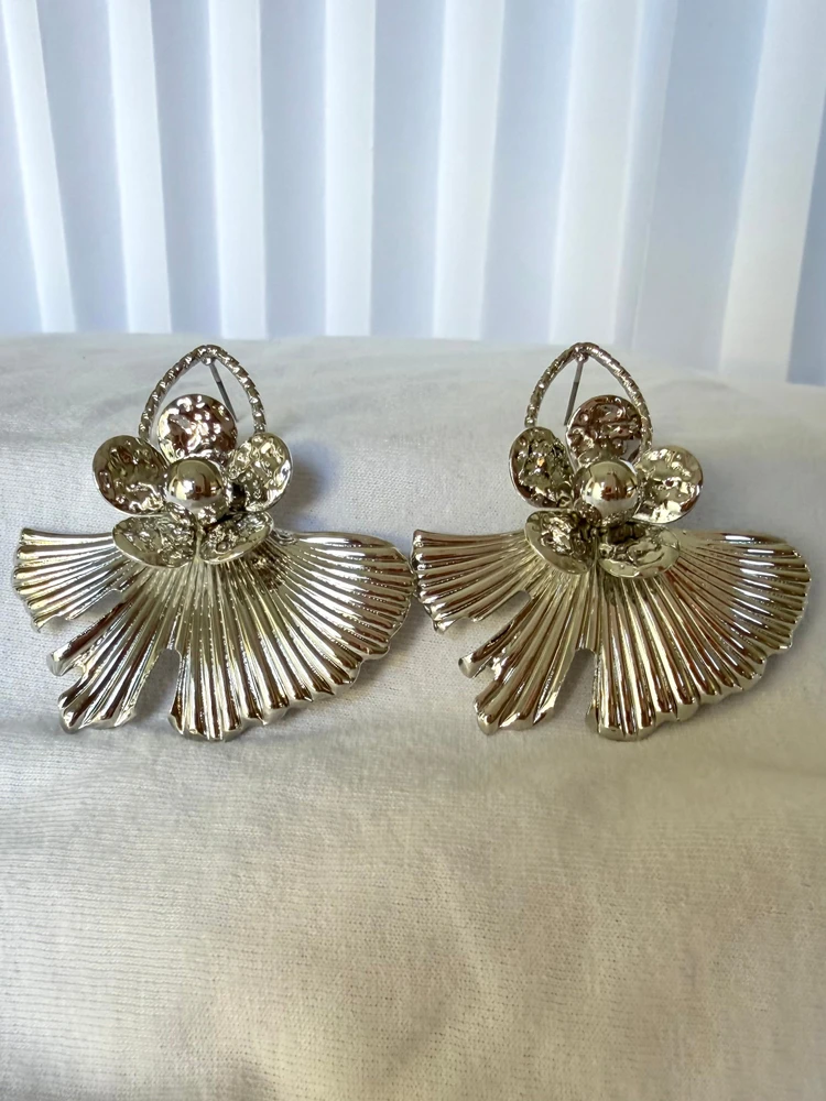 Um brinco impactante que une arte e sofisticação em cada detalhe. Com design em formato de leque inspirado em elementos florais, a peça traz textura marcante e acabamento metalizado de alto brilho, criando um visual moderno e elegante.