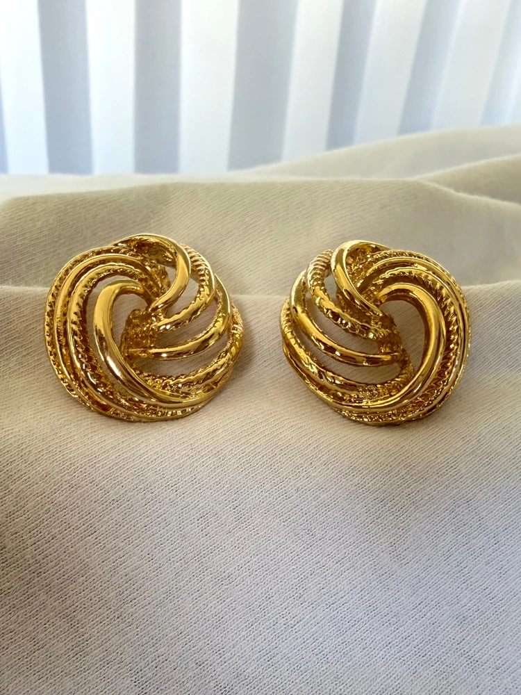 Brinco com design em nó entrelaçado que traz um visual moderno e sofisticado ao mesmo tempo. As curvas marcantes combinadas com detalhes texturizados criam profundidade e destaque, enquanto o acabamento dourado garante um brilho elegante que valoriza qualquer produção.