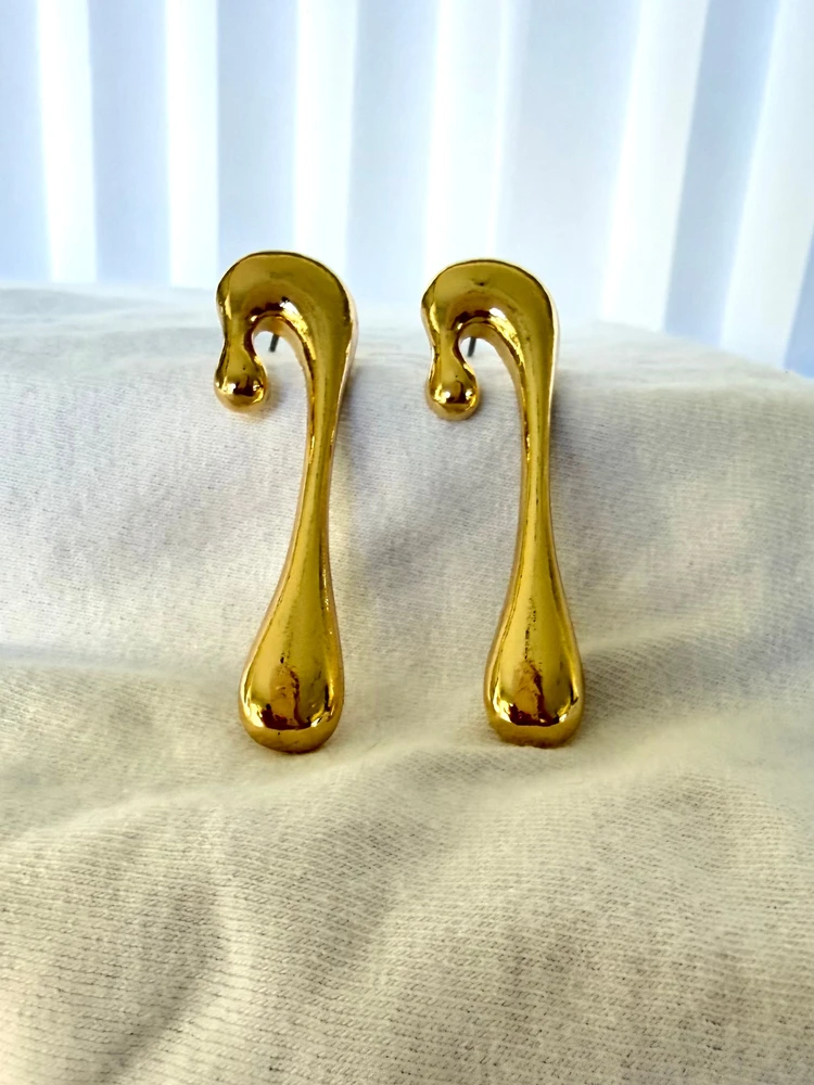 Brinco com design orgânico e formato alongado que traz modernidade e sofisticação em uma única peça. Seu acabamento espelhado destaca o brilho do metal, criando um efeito elegante e marcante no visual.