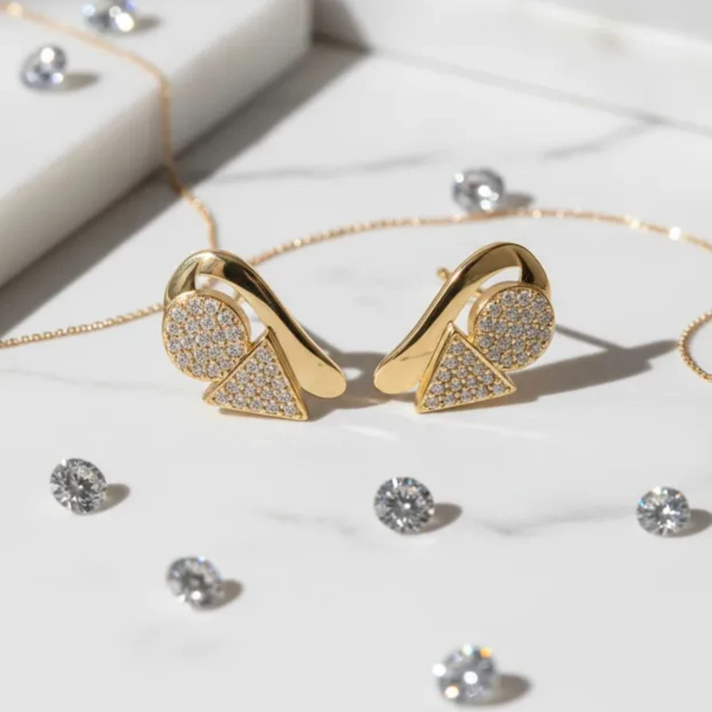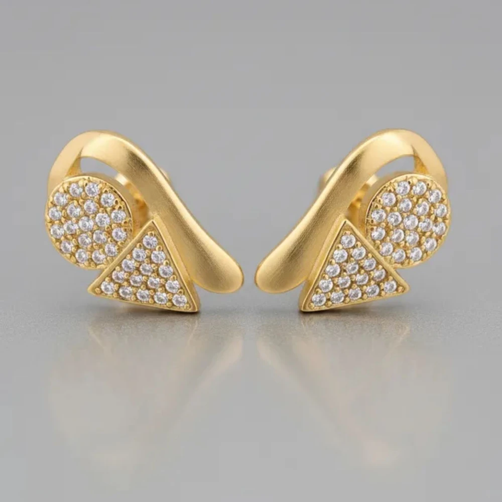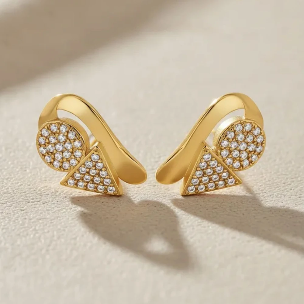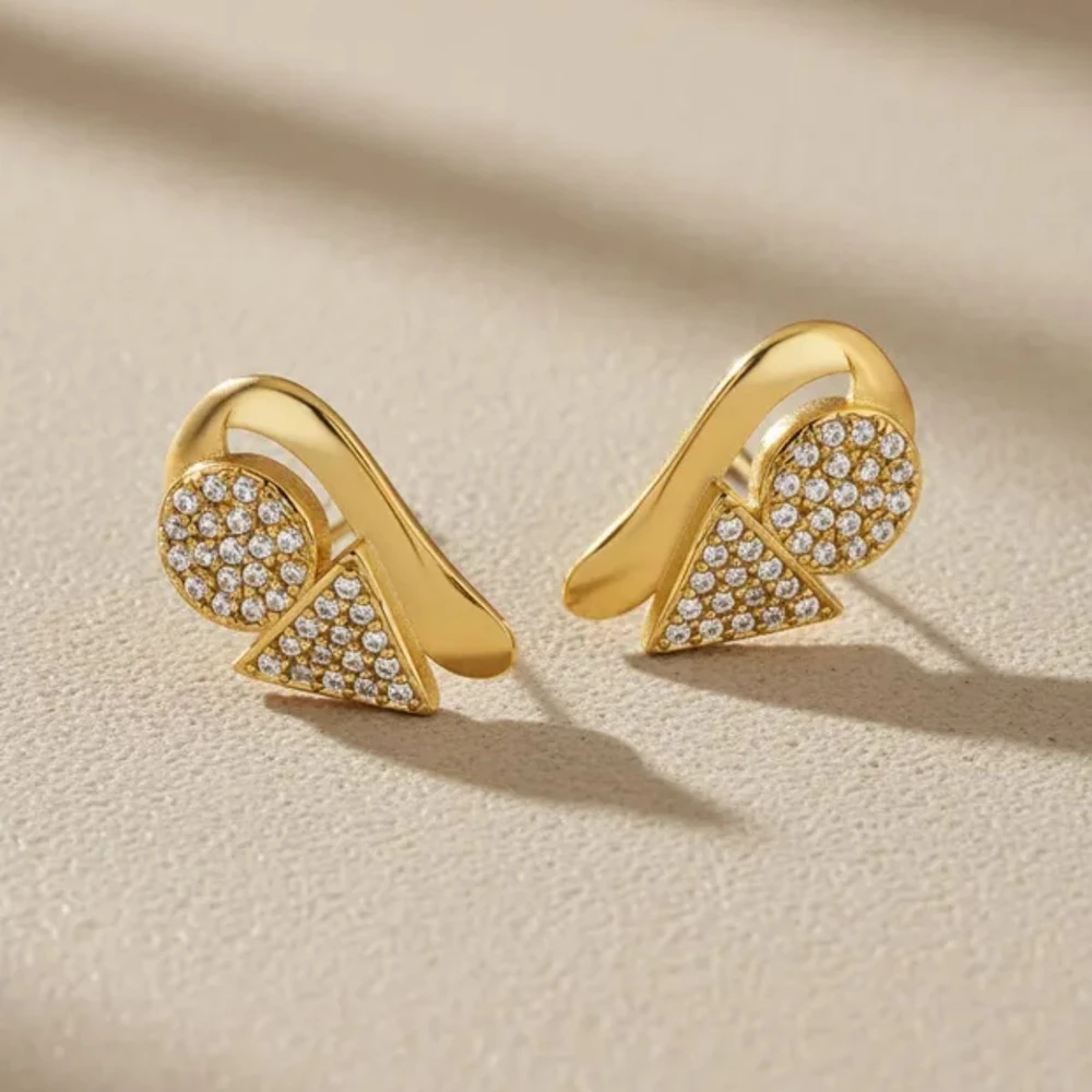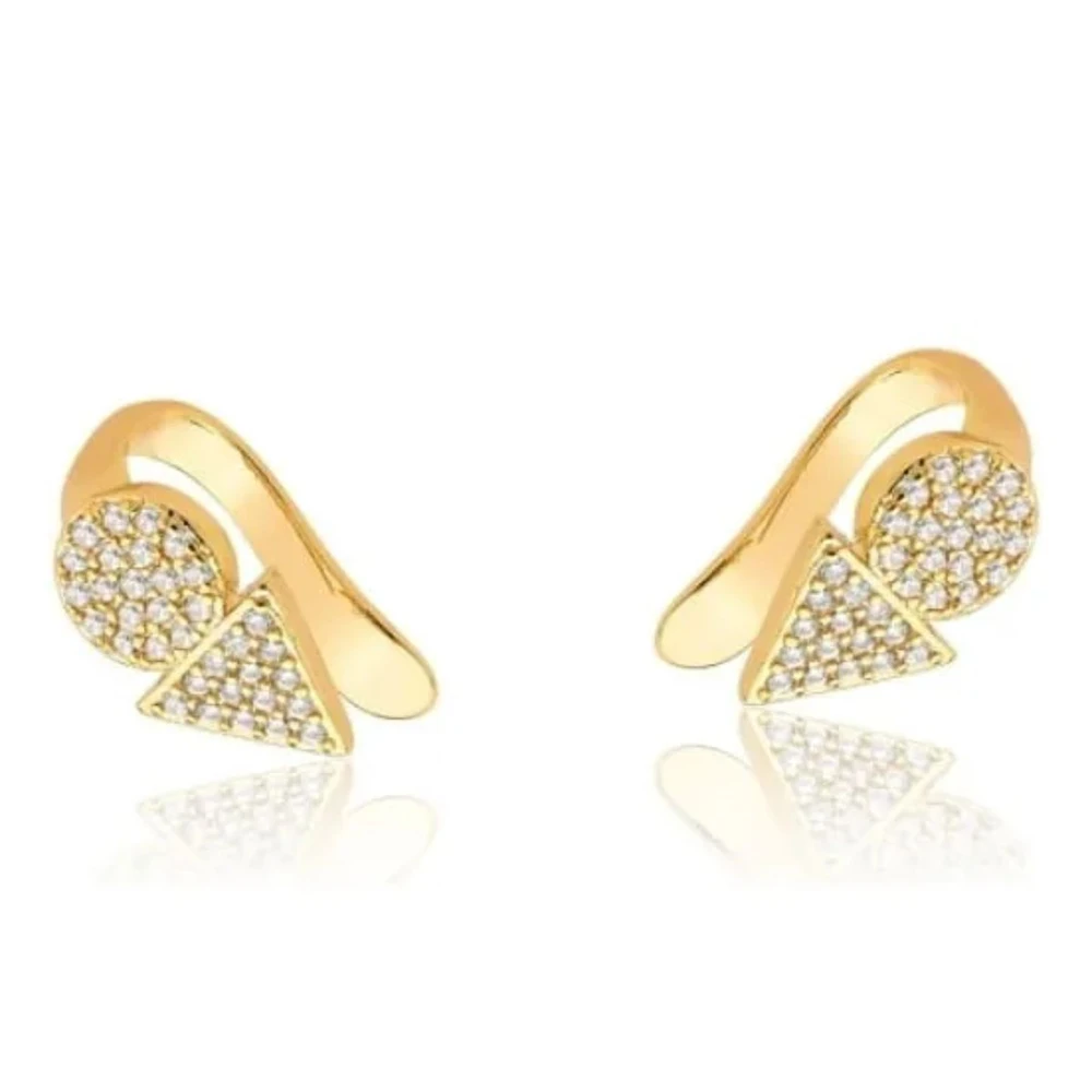 Piercing de orelha parte redonda e triangular cravejada com zircônias brancas.