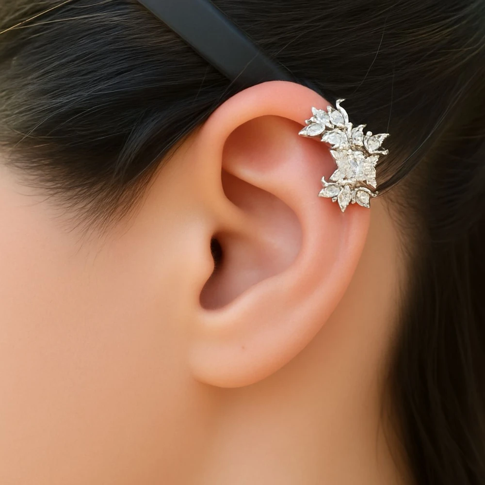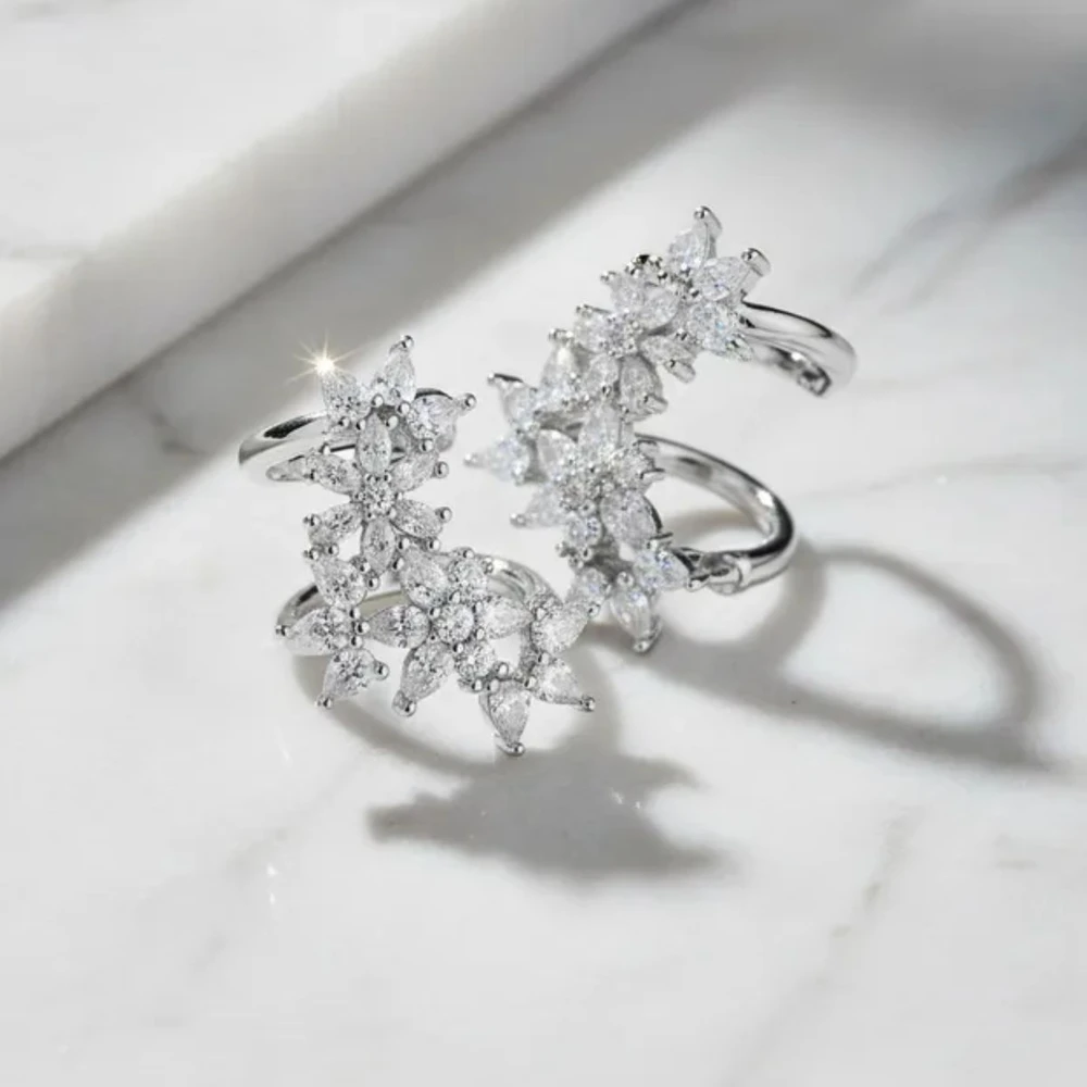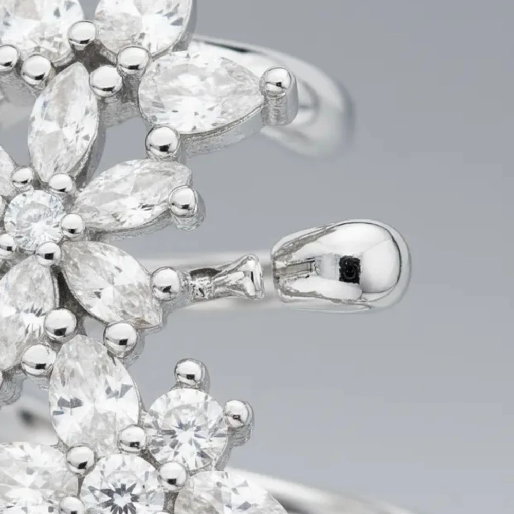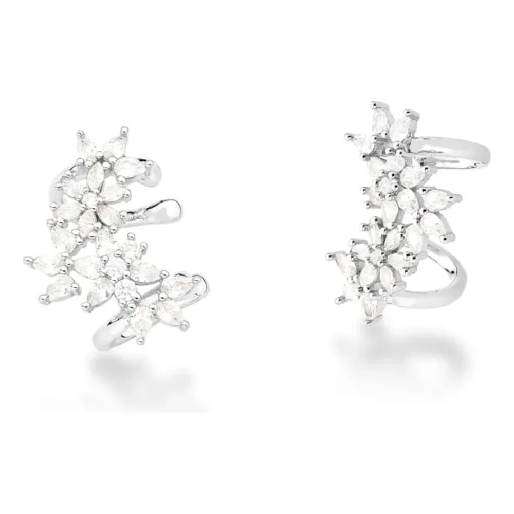 Piercing de orelha com flores cravejadas brancas banhado a ródio com duas voltas atrás.