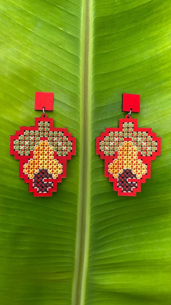 No RN temos o maior cajueiro do mundo, e aqui a fruta foi bordada manualmente em um brinco maximalista, em ponto cruz, sobre base em MDF pintada à mão.