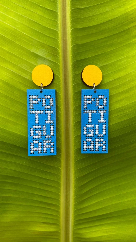 A palavra que simboliza o orgulho em sermos dessa terra, bordada manualmente em ponto cruz sobre base em MDF pintada à mão.