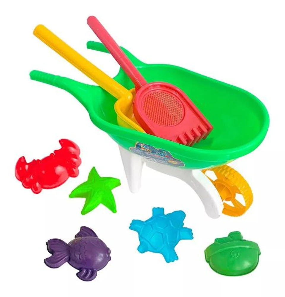 Kit de Praia Parque Super Carrinho de Mão Radical 9 Peças - Rei do BaldeDiversão garantida ao ar livre! O Kit de Praia Parque Super Carrinho de Mão Radical 9 Peças é perfeito para estimular a criatividade e a interação das crianças. Feito com material resistente e seguro, ele acompanha um carrinho de mão e acessórios essenciais para brincar na areia ou no parque.O que vem no kit?1 Carrinho de mão ergonômico1 Pá grande1 Rastelo grande6 Formas de animais para modelar areiaCom cores vibrantes e design funcional, esse kit ajuda no desenvolvimento motor e na coordenação das crianças, tornando o aprendizado ainda mais divertido.Idade recomendada: a partir de 3 anosIdeal para praia, parque e quintalLeve e fácil de transportarDeixe a brincadeira mais criativa e interativa!