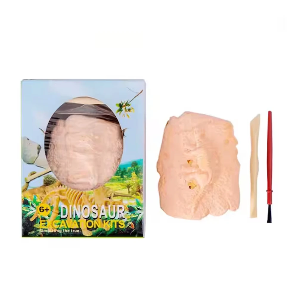 Acompanha ferramentas de escavação, como um cinzel e um pincel, para ajudar a desenterrar o fóssil.