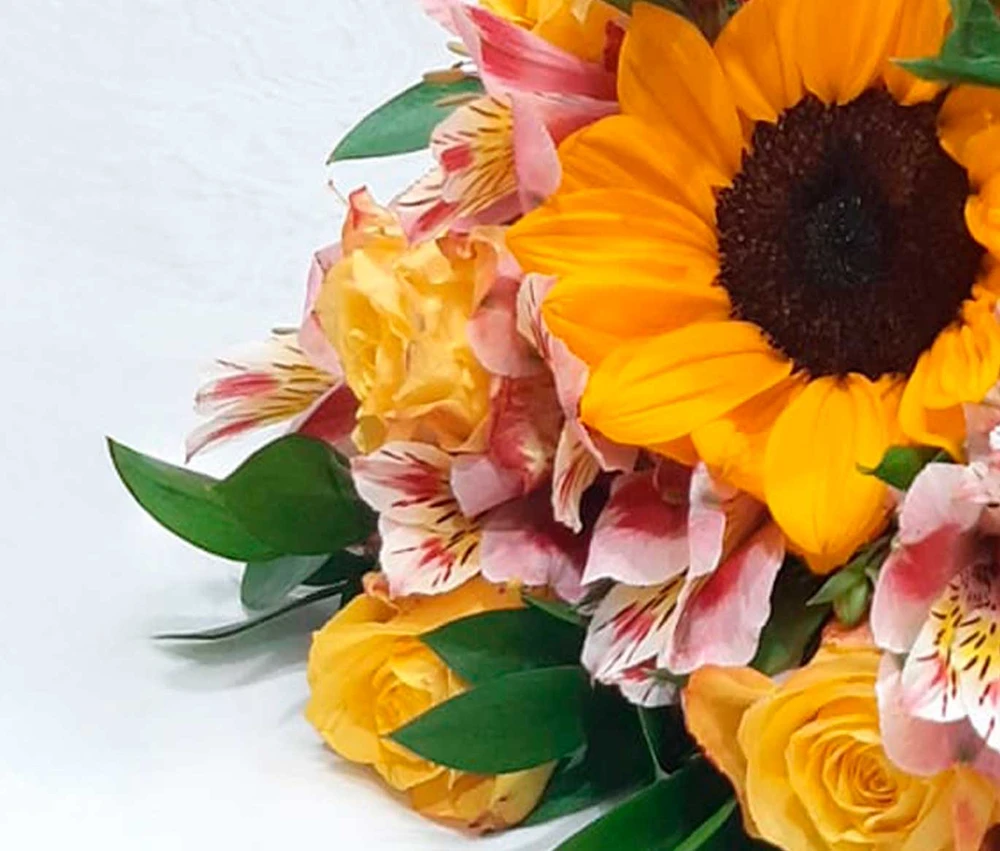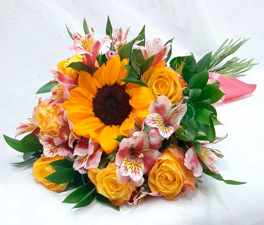 Flores frescas e selecionadas: 1 girassol imponente, rosas amarelas sofisticadas e delicadas Astromélias em tons rosados.