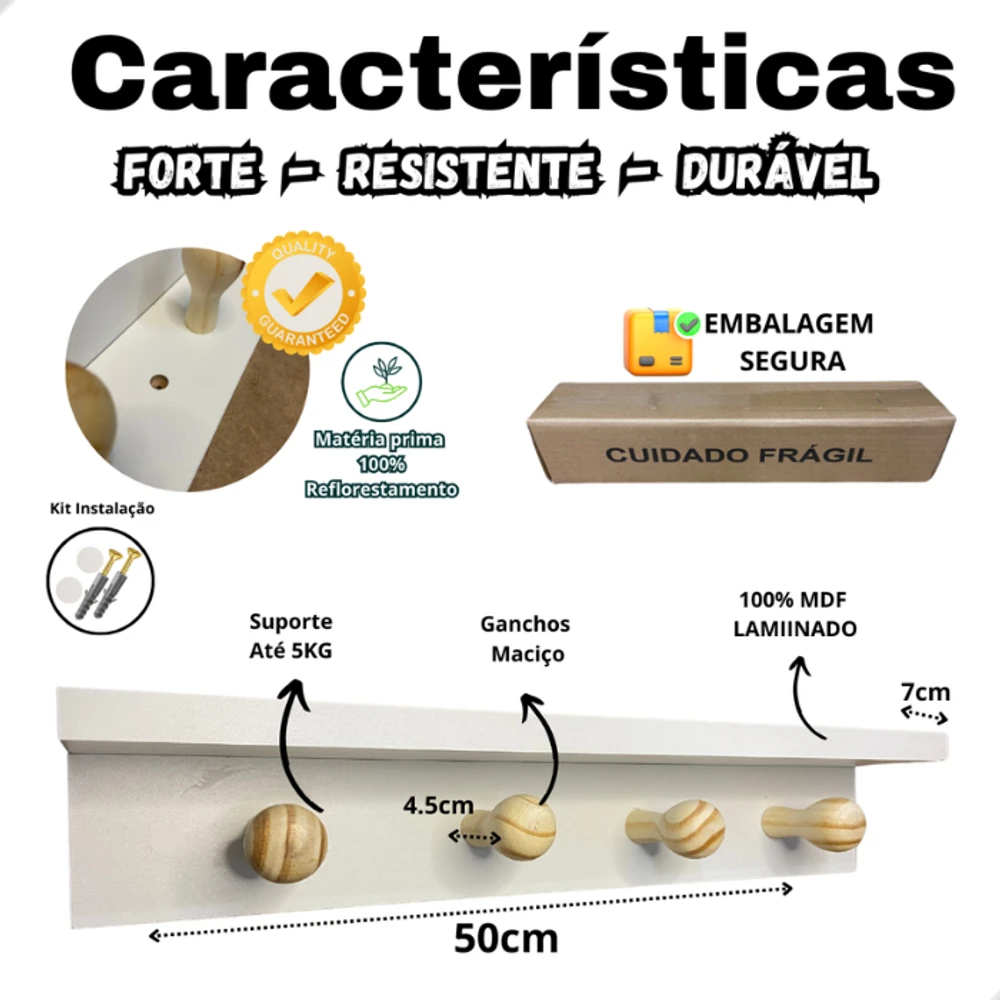Mantenha seu ambiente organizado e com estilo com este prático cabideiro de parede com prateleira integrada. Com design moderno e funcional, ele é perfeito para pendurar bolsas, casacos, chaves e acomodar objetos decorativos na prateleira superior.Características do Produto:Cor: BrancoMaterial: 100% MDF laminadoCapacidade de Carga: Até 5 kg no totalPenduradores: 4 unidadesAcompanha: Kit de instalação completoMedidas:Comprimento: 50 cmLargura da Prateleira: 7 cmLargura de cada Pendurador: 4,5 cmBenefícios:Design compacto e moderno, ideal para otimizar espaços;Fácil instalação com kit incluso;Estrutura resistente com acabamento de qualidade;Ideal para halls de entrada, quartos, banheiros ou lavanderias;Prateleira superior prática para objetos decorativos e utilitários.Compre agora seu Cabideiro de Parede com Prateleira em MDF e traga organização e elegância para qualquer ambiente!