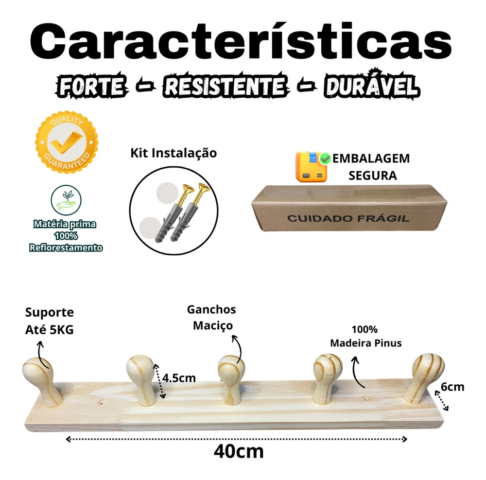 Organize seus espaços com praticidade e estilo com o Cabideiro de Parede em Madeira Pinus com 5 Penduradores. Perfeito para halls de entrada, quartos, banheiros ou áreas de serviço, ele alia funcionalidade a um design discreto e elegante. Seus cinco ganchos resistentes são ideais para acomodar casacos, bolsas, mochilas, chaves e muito mais no dia a dia.