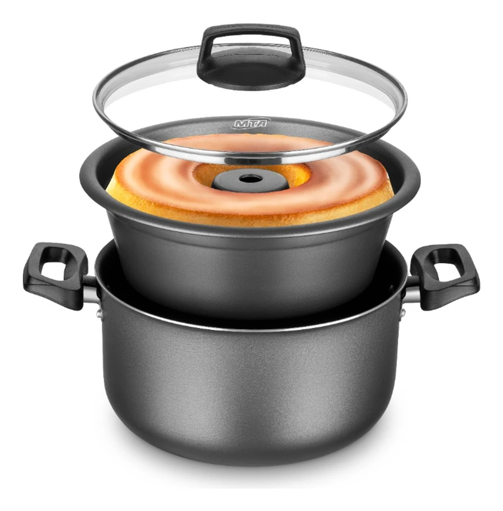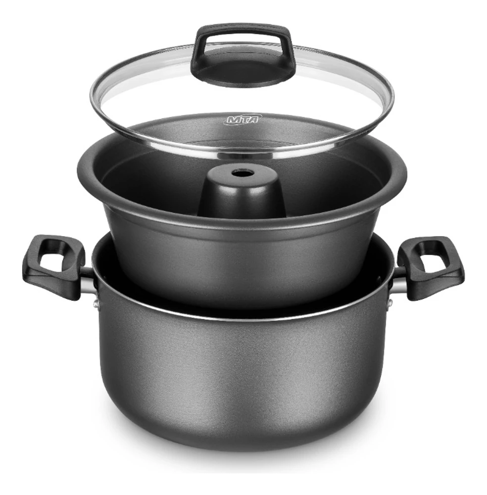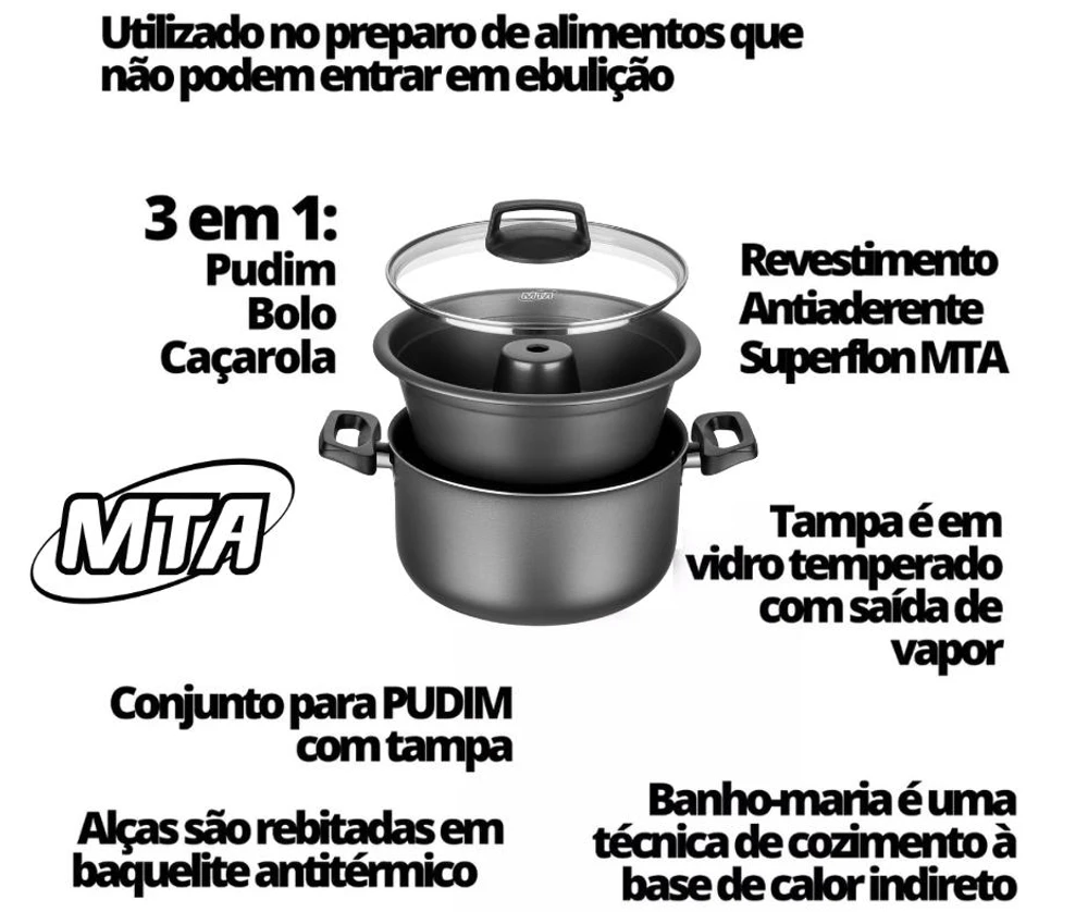 Conjunto antiaderente modelo 8923 da MTA é ideal para quem aprecia preparar pudins de maneira fácil e conveniente. Inclui uma forma de pudim e uma caçarola para o banho-maria.