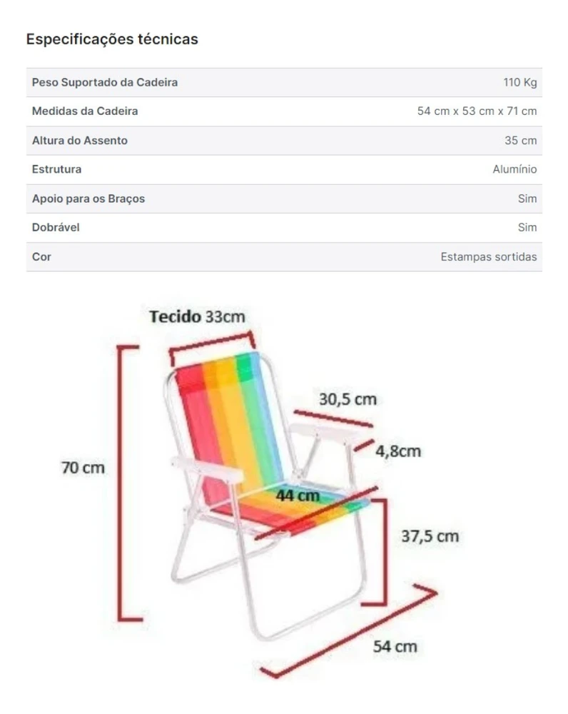 KIT 02 und Cadeira de Praia Alta em Alumínio Bel Fix Cores sortidas, Dobrável, fácil e prática de carregar, é ideal para ser levada para praia, camping, pescaria ou para aquela reunião de final de tarde com os amigos na varanda.Atenção: Cores Sortidas, serão enviadas conforme disponibilidade em estoque.Especificações Técnicas:Modelo: 25500Cor: sortidas (SERÃO ENVIADAS CONFORME DISPONIBILIDADE EM ESTOQUE)Cadeira 100% em polietilenoTubo em alumínioPeso máximo suportado: 90kgCadeira de Praia Dobrável em Alumínio e Polietileno 25500 Bel fixExcelente Cadeira de Praia Dobrável Bel fix 25500, fabricada com estrutura tubular em Alumínio e Tecido 100% em Polietileno. Ideal para ser utilizada em diversos ambientes como Praia, Camping (Acampamentos), Piscina e em todos os ambientes de Casa.Benefícios da Cadeira Praia Alta Bel fix:- Cadeira alta com braços. Muito Confortável- Leve e Dobrável. Fácil de guardar e Transportar- Tubos em Alumínio e Tecido 100% em polietileno- Durável e resistente ao tempo- Suporta até 90 kgLargura(cm): 7.00Altura(cm): 67.00Comprimento(cm): 54.00Peso(kg): 1Capacidade (KG): 90 kgDimensões Braço: 30,5x 4,8 x 4 cmDistância do assento ao chão: 37,5 cmMaterial: Alumínio e Polietileno*OBS: SERÁ ENVIADA AS CORES CONFORME DISPONIBILIDADE DO ESTOQUE*OBS: ESTAMPAS SORTIDAS.