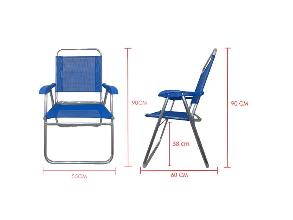 Esta cadeira de praia alta é confeccionada em tecido sanete poliéster e possui uma estrutura de alumínio. O braço é de plástico e da mesma cor do tecido. A cadeira tem capacidade para suportar um peso de até 100 Kgs.