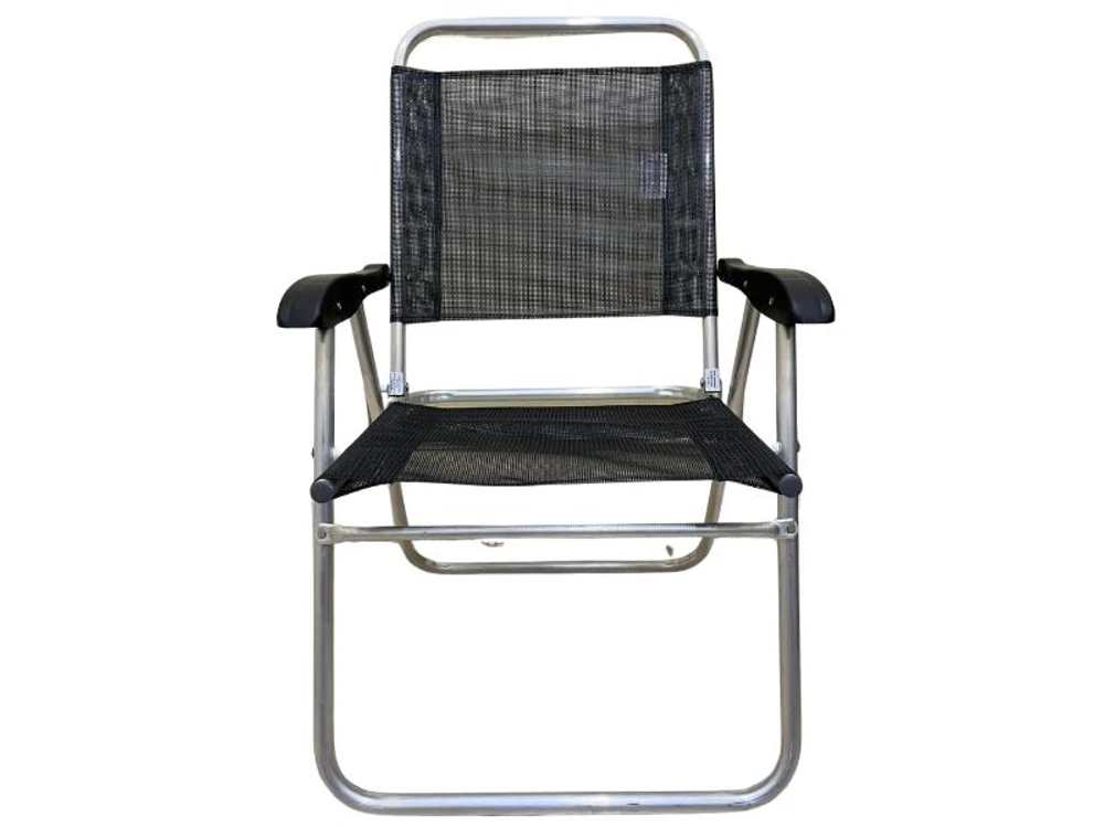 Esta cadeira de praia alta é confeccionada em tecido sanete poliéster e possui uma estrutura de alumínio. O braço é de plástico e da mesma cor do tecido. A cadeira tem capacidade para suportar um peso de até 100 Kgs.