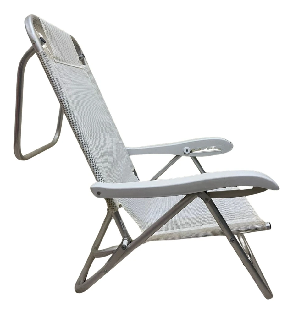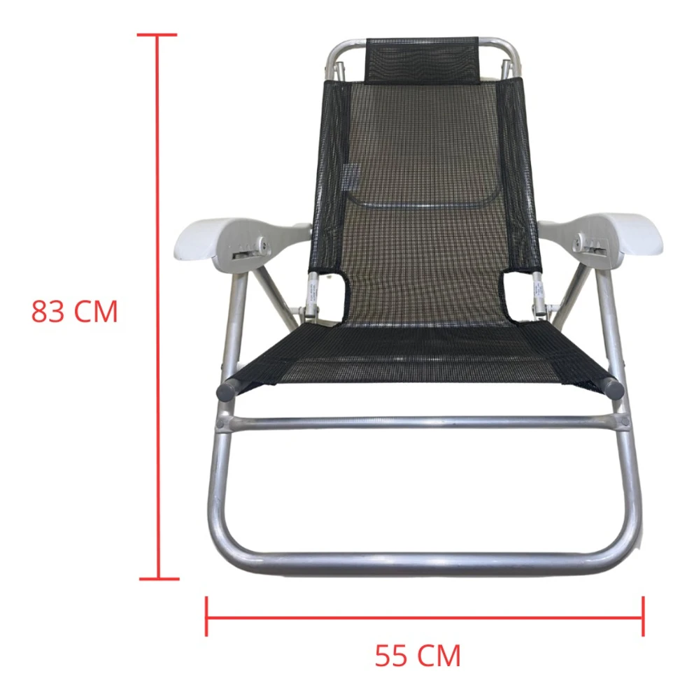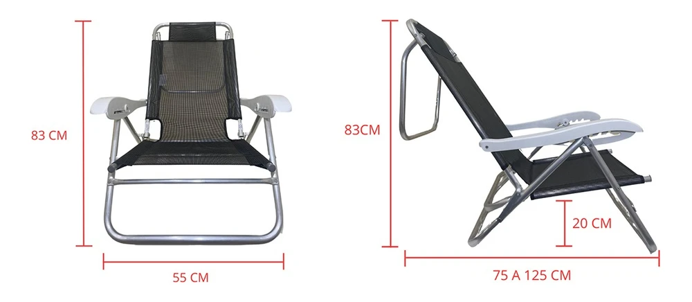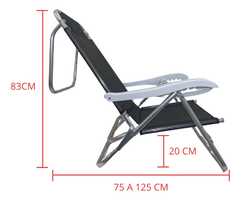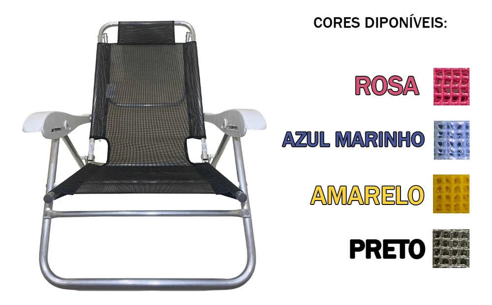 TEMOS ENVIOS DIARIOS DE SEGUNDA A SEXTA FEIRA AS 13 HORAS.Frete pago é a parte no ato da compra junto com o produto, valores especificados para as regiões Sul, Sudeste e Centro Oeste. Outras localidades consultar o frete.O valor do frete esta especificado para 01 unidade do produto.Portanto se for comprado mais de uma cadeira, esse valor se multiplica pela quantidade de cadeiras. Fazemos o alinhamento pelo Chat.ANTES DE EFETUAR A SUA COMPRA, CONSULTE O VALOR DE FRETE NA CAIXA DE MENSAGEM, ENVIANDO NA PERGUNTA O CEP DE DESTINO RESPONDEMOS COM O VALOR DO ENVIO.Cores Disponiveis : Azul-Marinho, Rosa, Preta e AmareloConsultar disponibilidade pelo Chat.DescriçãoExtremamente resistente, a Cadeira Sanete Reclinavel Preguiçosa 05 Poisições é feita em Alumínio conta com estrutura fabricada pela Ronchetthi em alumínio de excelente qualidade, peças plásticas em polipropileno, rebites em aço e tela em sannet liso, com proteção U, anti-mofo e de fácil limpeza.O alumínio proporciona mais leveza e durabilidade. Seu assento e encosto são mais largos que as cadeiras convencionais, dessa maneira, ela é mais confortável, mais estável e segura, excelente para pessoas mais altas ou com sobrepeso.A Cadeira Cadeira Sanete Reclinavel Preguiçosa 05 Poisições, é uma cadeira reclinavel com 05 posições, proporcionando prazer e qualidade no seu lazer.Possui estrutura reforçada e armação invertida, proporcionando maior conforto para as pernas, suportando até 120 Kg.EspecificaçõesMATERIAL: AlumínioCAPACIDADE: 140 kg
