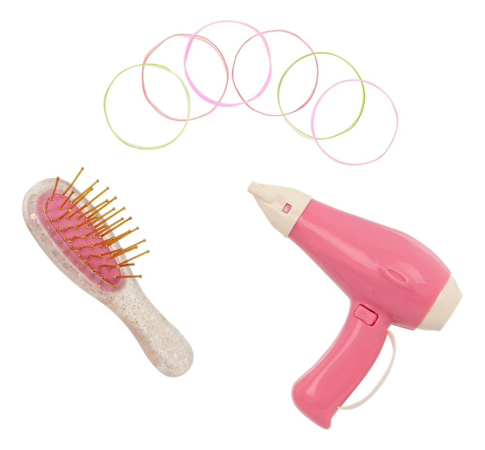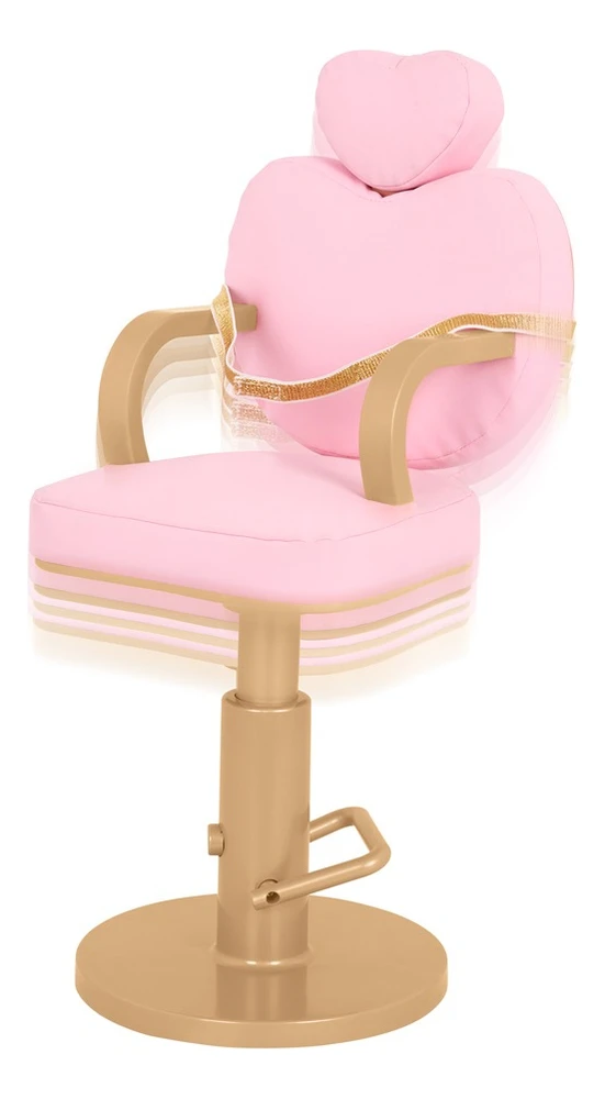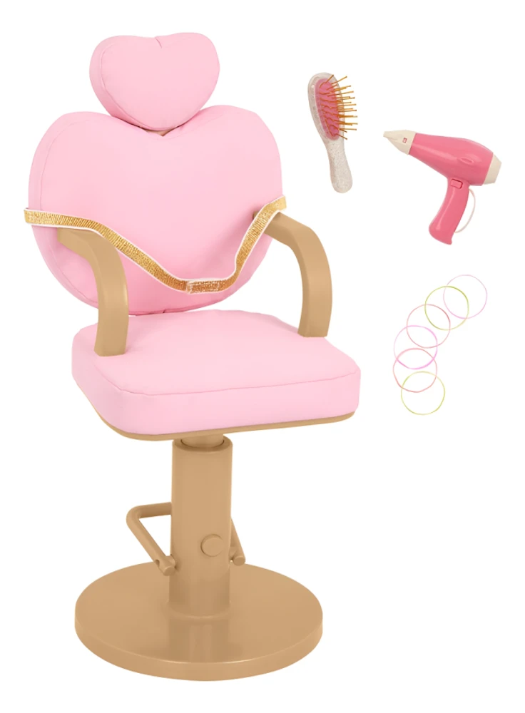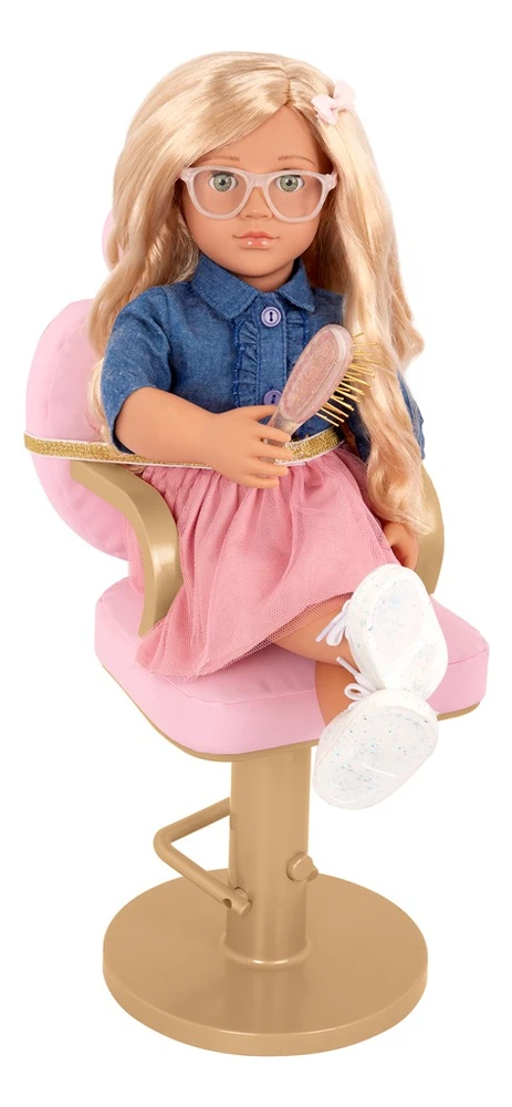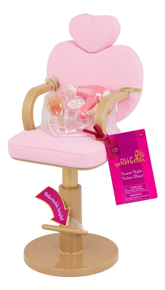 Estabeleça novas tendências e crie looks fabulosos com a cadeira de salão Sweet Styles da Our Generation para bonecas de 46cm! Projetada em cores rosa e dourado, esta cadeira de salão para bonecas possui um assento acolchoado e ajustável, proporcionando à sua boneca uma experiência de salão autêntica. Com um pedal para ajustar a altura do assento, e um botão para retornar à posição original, sua boneca pode desfrutar de um verdadeiro tratamento de salão! Além disso, o conjunto inclui acessórios extras como uma escova de cerdas metálicas, 6 elásticos para cabelo e um secador de cabelo que emite sons realistas, para dar aquele toque profissional a cada penteado!