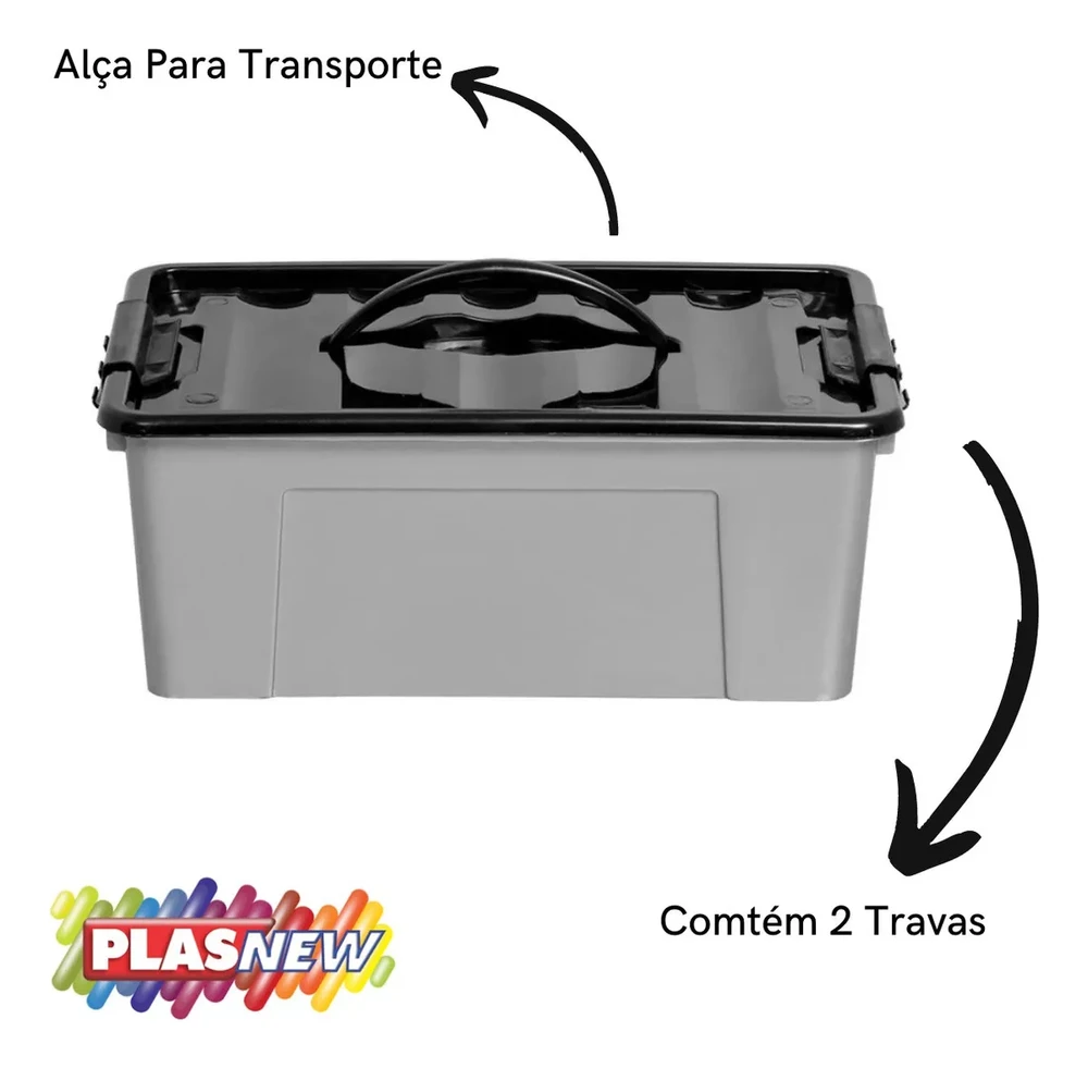 Possui trava de fechamento que prende a tampa à caixa plástica e garante segurança aos itens armazenados e uma alça que facilita no transporte.
