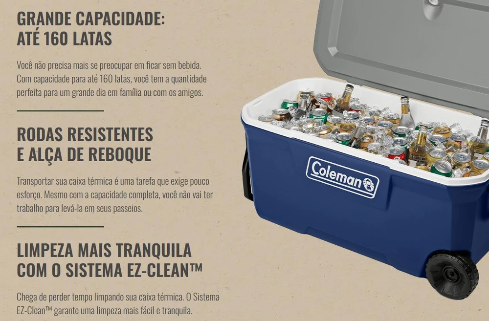 A Caixa Térmica Lakeside com Rodas 316 Series 100 Qt 94.6 Litros - Coleman é o produto perfeito para quem gosta de viagens e atividades ao ar livre. Esta caixa térmica é da linha 316 Series, uma série mais completa que possui materiais mais refinados e resistentes com inovações em sua estrutura.