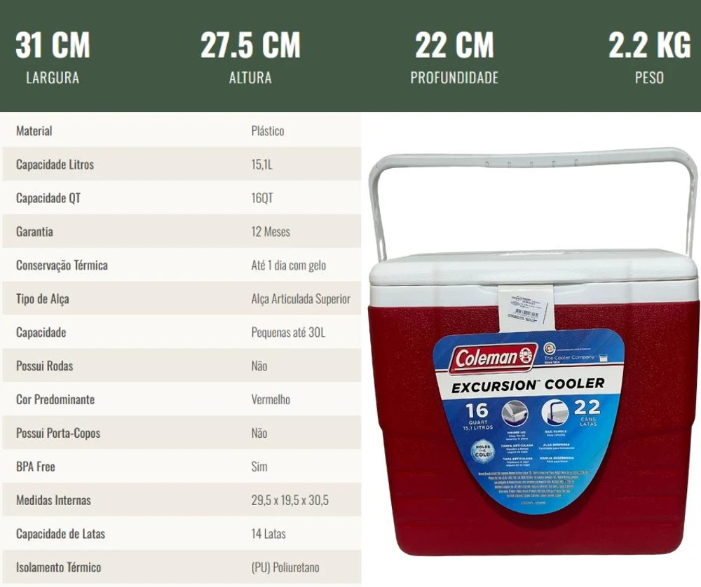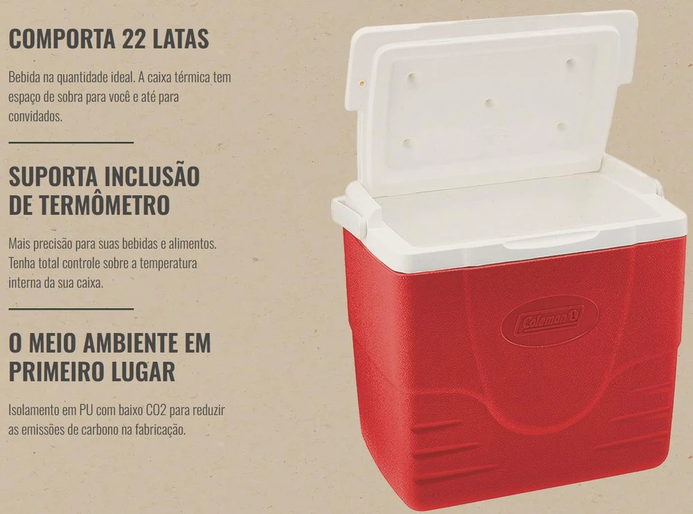 A Caixa Térmica Coleman 16QT possui alça confortável para facilitar o transporte, com tampa articulada. Fabricada em polietileno de alto impacto, tem isolamento térmico em espuma de poliuretano, prática e fácil de limpar. Construída com matéria prima ecologicamente correta, Thermozone insulation.