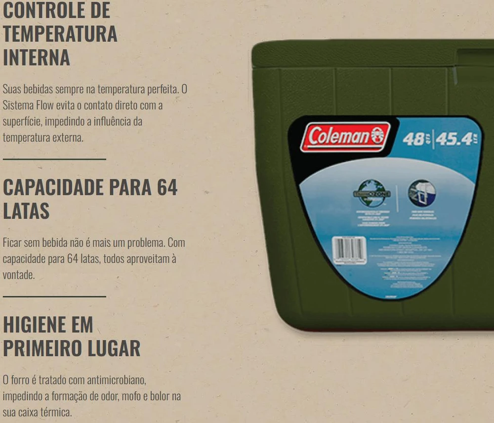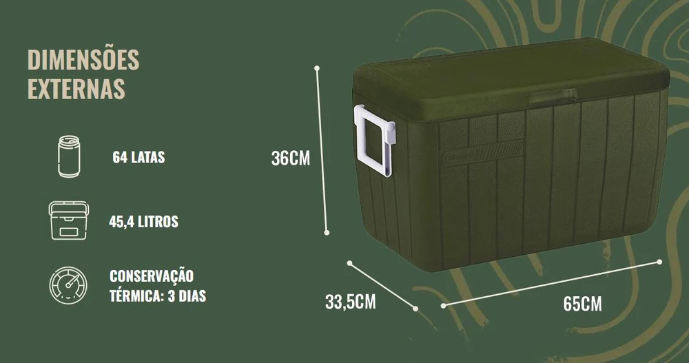 Conheça a caixa térmica da Coleman, com 45,4 litros de capacidade, projetada para elevar sua experiência ao ar livre. Com espaço para armazenar até 64 latas e mantendo o gelo até 3 dias, essa caixa térmica é perfeita para aventuras prolongadas, garantindo que suas bebidas fiquem geladas por muito mais tempo.
