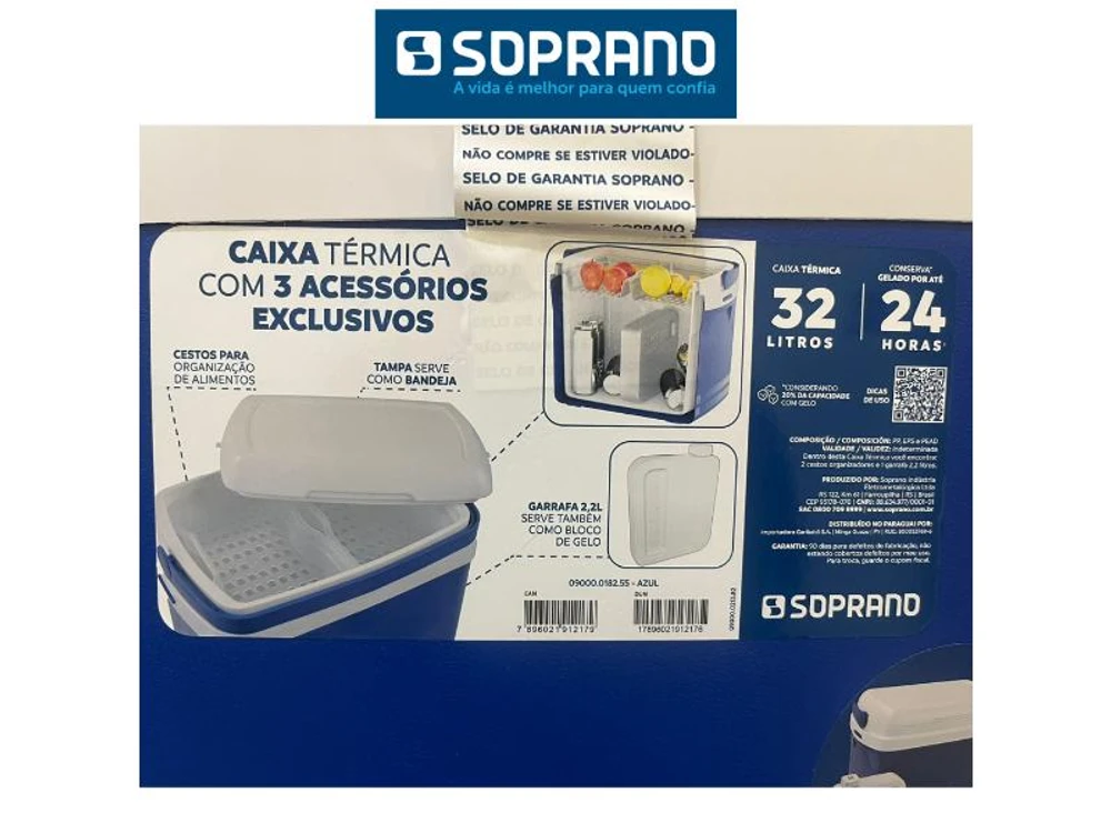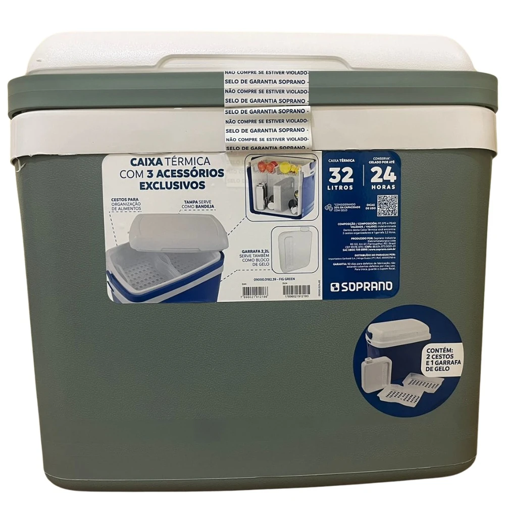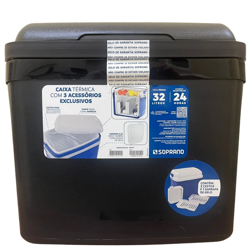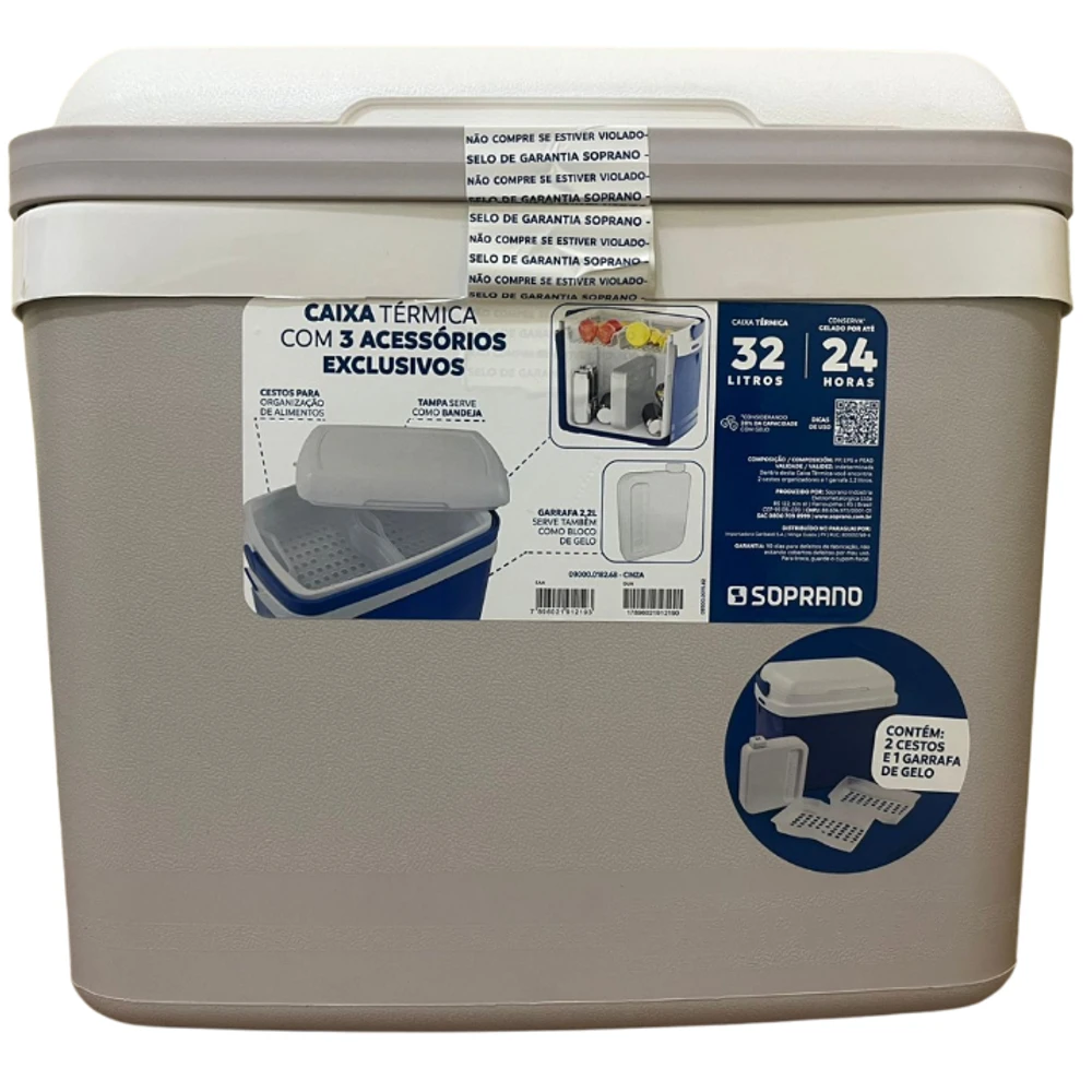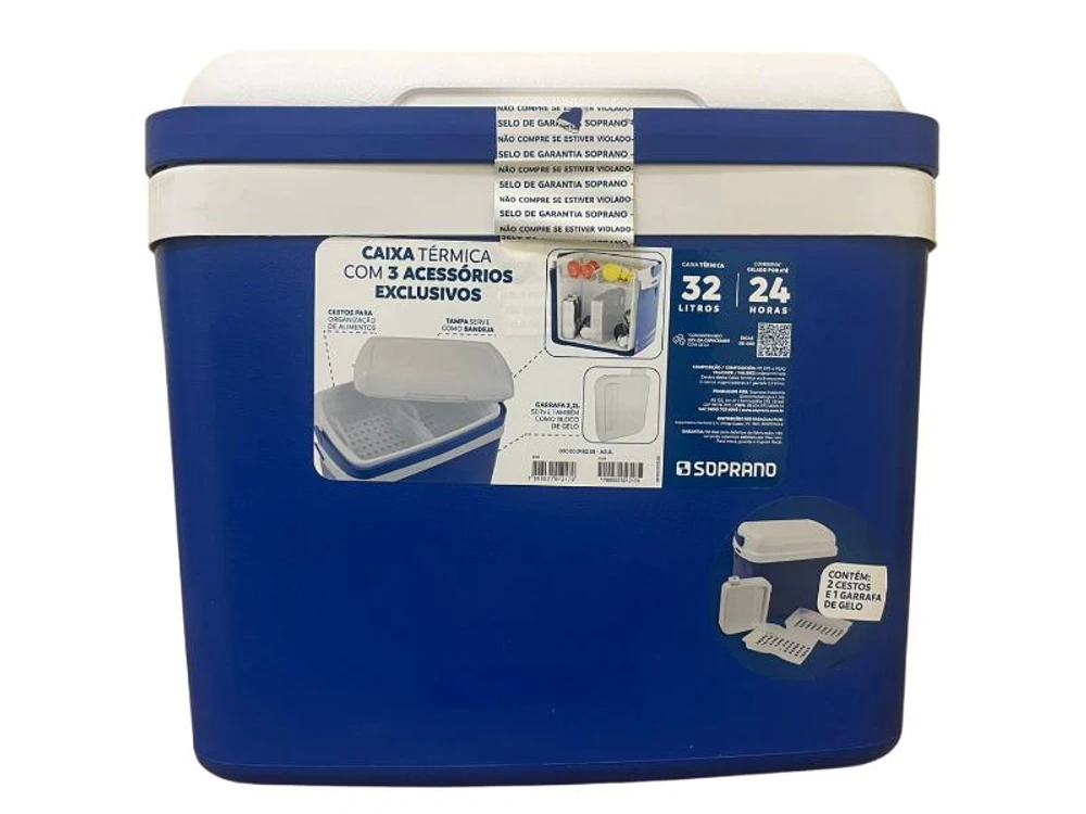 Sobre o ProdutoSeu passeio com tudo organizado! A Caixa Térmica com acessórios da Soprano te ajuda a manter os alimentos secos, separados dos molhados, mantendo a conservação térmica por mais tempo.2 cestos e 1 garrafa de gelo extra, fazem com que essa caixa seja ideal para a sua organização.A tradiconal caixa da Soprano agora com 3 acessórios exclusivos: 2 cestos organizadores removiveis e empilháveis, 1 garrafa para água de 2,2 litros, que, com água congelada, aumenta a eficiência térmica da caixa.Tampa serve como bandeja.Capacidade de 32 litros; 24 horas de degelo total; Isolamento em EPS; Alça retrátil; Pegas laterais; Tampa com trava.
