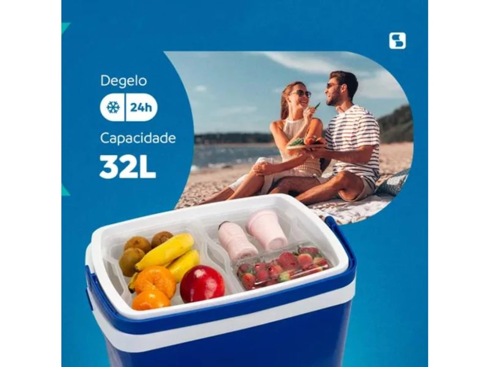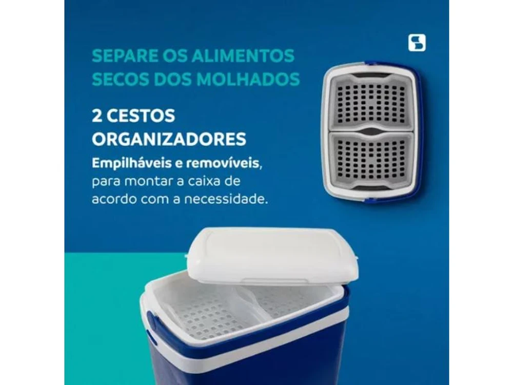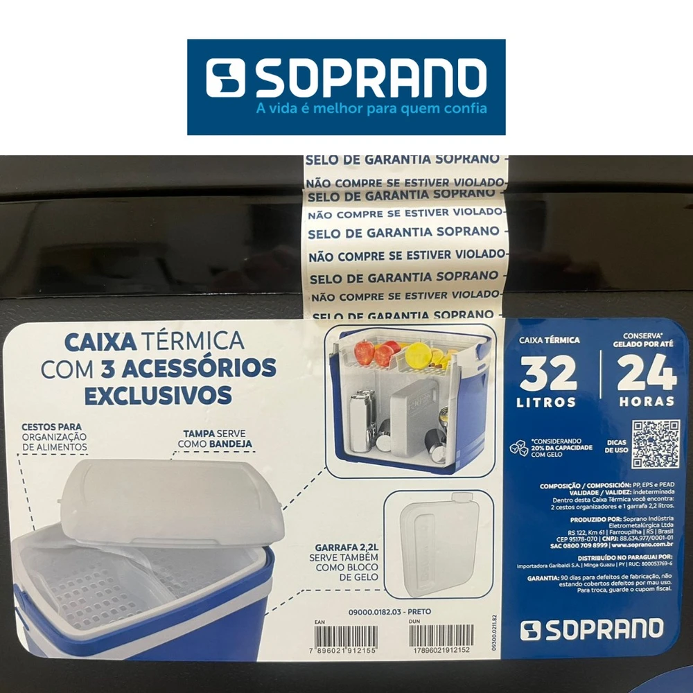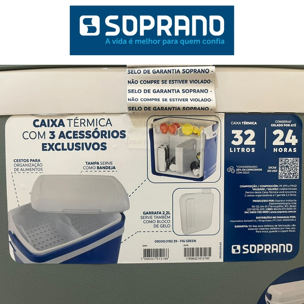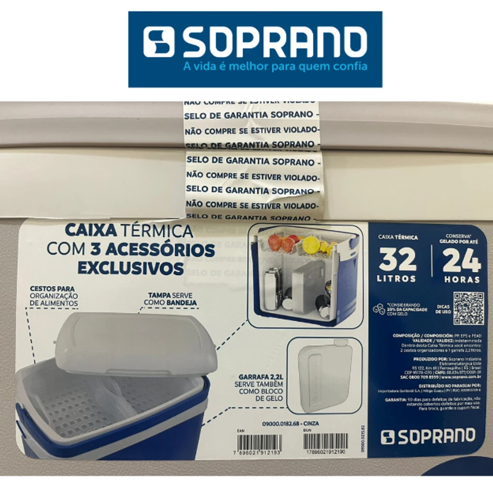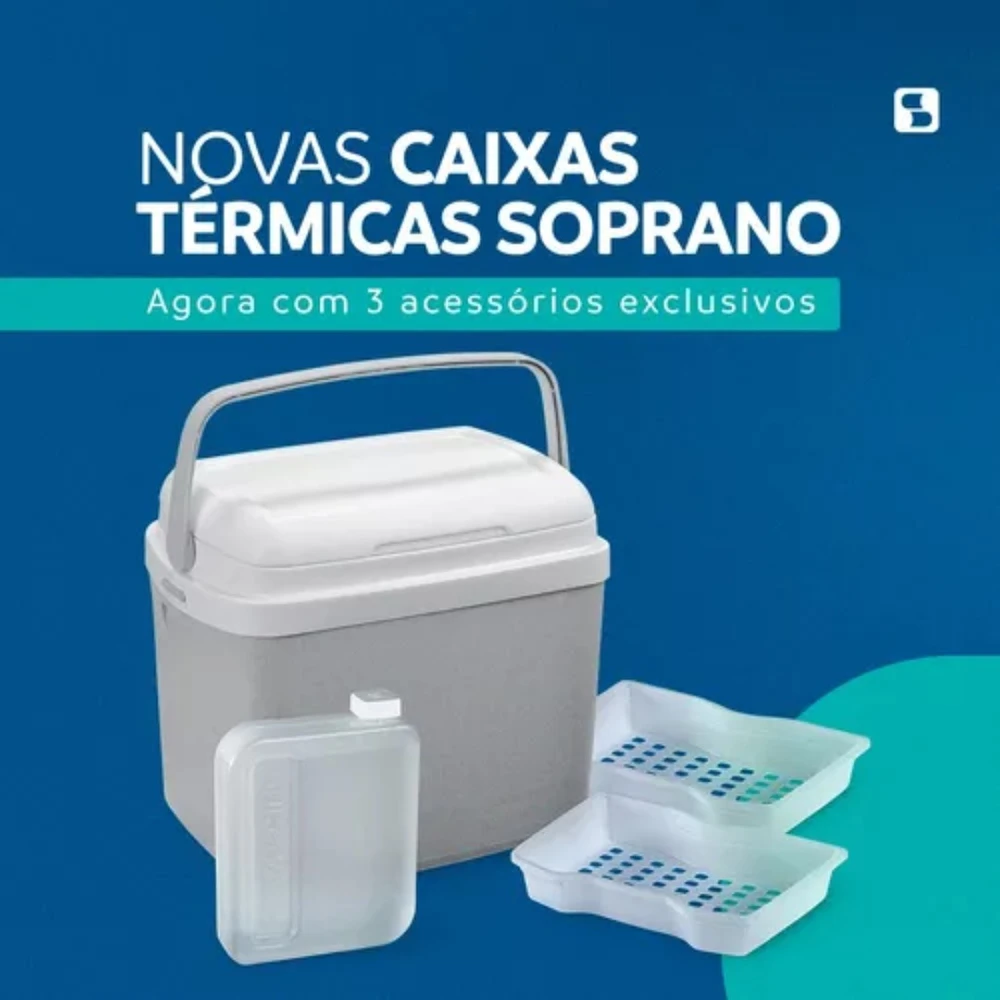 Sobre o ProdutoSeu passeio com tudo organizado! A Caixa Térmica com acessórios da Soprano te ajuda a manter os alimentos secos, separados dos molhados, mantendo a conservação térmica por mais tempo.2 cestos e 1 garrafa de gelo extra, fazem com que essa caixa seja ideal para a sua organização.A tradiconal caixa da Soprano agora com 3 acessórios exclusivos: 2 cestos organizadores removiveis e empilháveis, 1 garrafa para água de 2,2 litros, que, com água congelada, aumenta a eficiência térmica da caixa.Tampa serve como bandeja.Capacidade de 32 litros; 24 horas de degelo total; Isolamento em EPS; Alça retrátil; Pegas laterais; Tampa com trava.