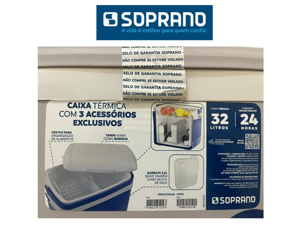 A tradiconal caixa da Soprano agora com 3 acessórios exclusivos: 2 cestos organizadores removiveis e empilháveis, 1 garrafa para água de 2,2 litros, que, com água congelada, aumenta a eficiência térmica da caixa.