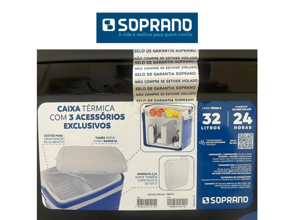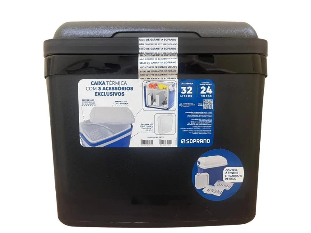 A tradiconal caixa da Soprano agora com 3 acessórios exclusivos: 2 cestos organizadores removiveis e empilháveis, 1 garrafa para água de 2,2 litros, que, com água congelada, aumenta a eficiência térmica da caixa.