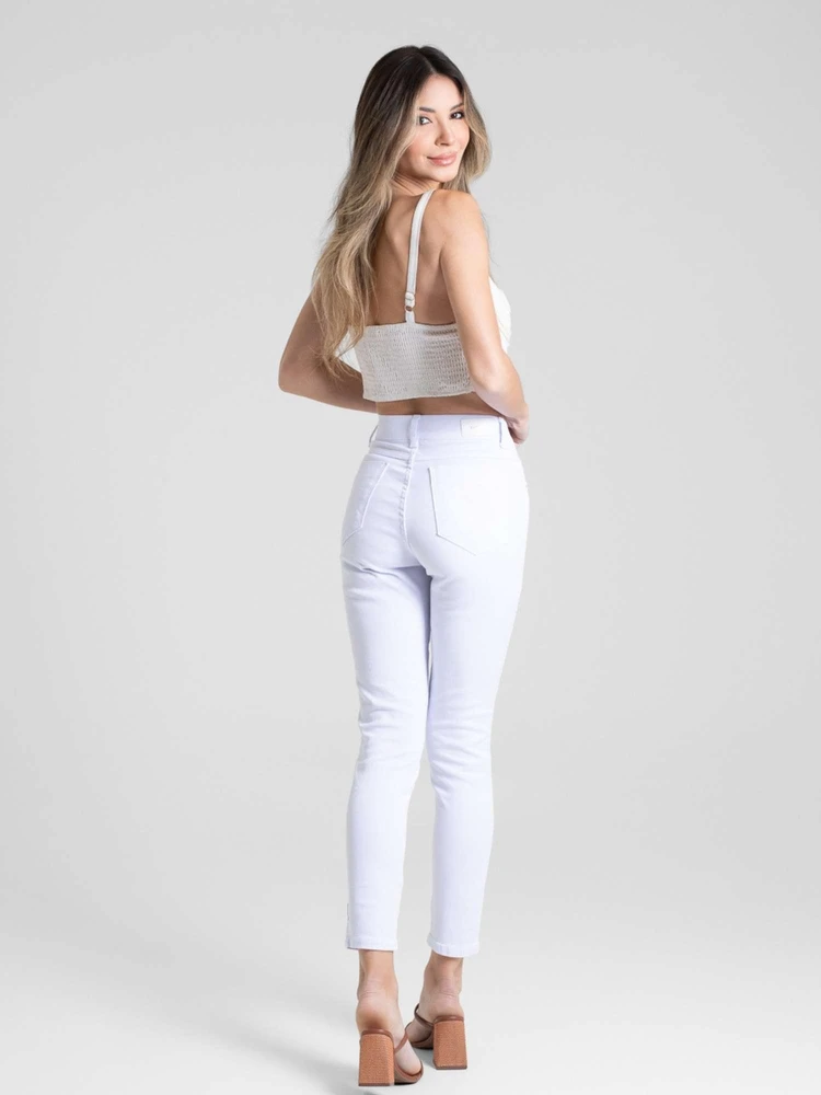 Calça feminina modelo cigarrete, confeccionada em sarja com elastano, que valoriza a silhueta sem perder o conforto.