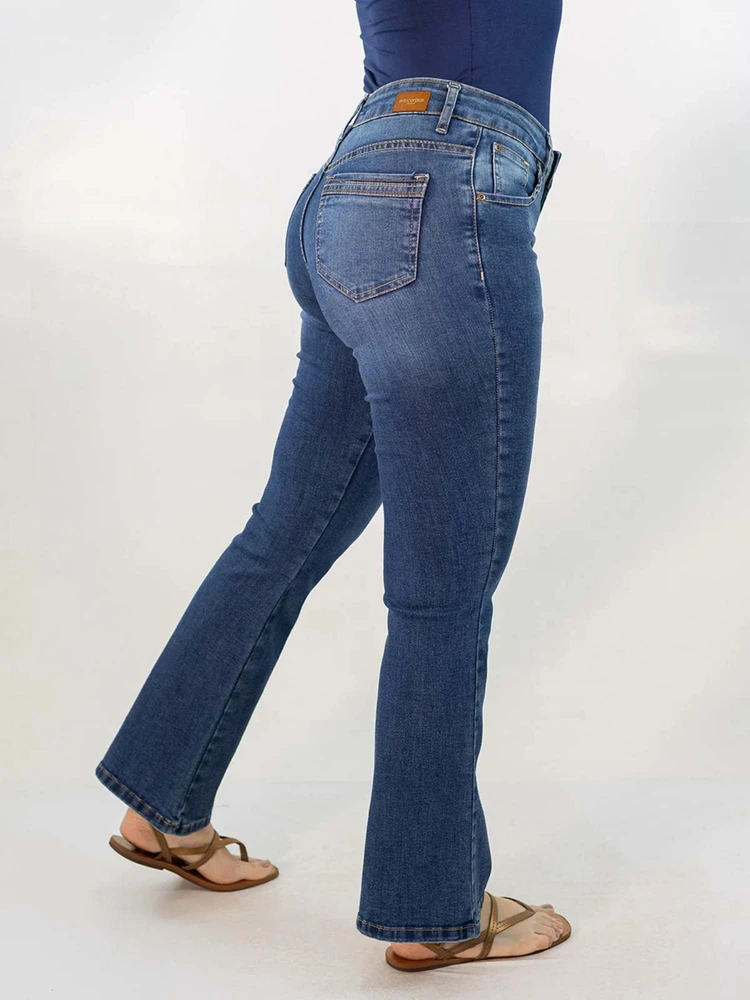 O cós alto valoriza a silhueta e proporciona conforto, enquanto o corte flare equilibra o visual, trazendo um toque elegante e moderno.