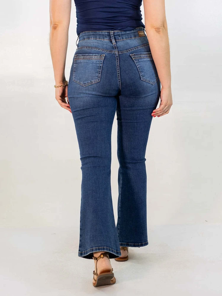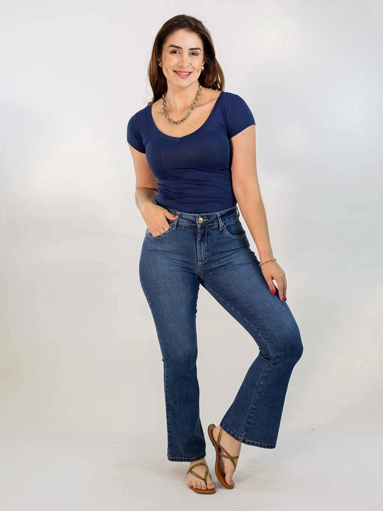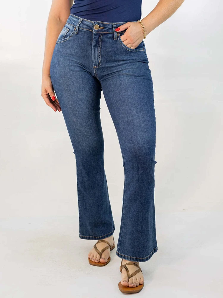 Calça jeans feminina com cintura alta e modelagem flare, no comprimento pétit, ideal para quem prefere a barra um pouco mais curta.